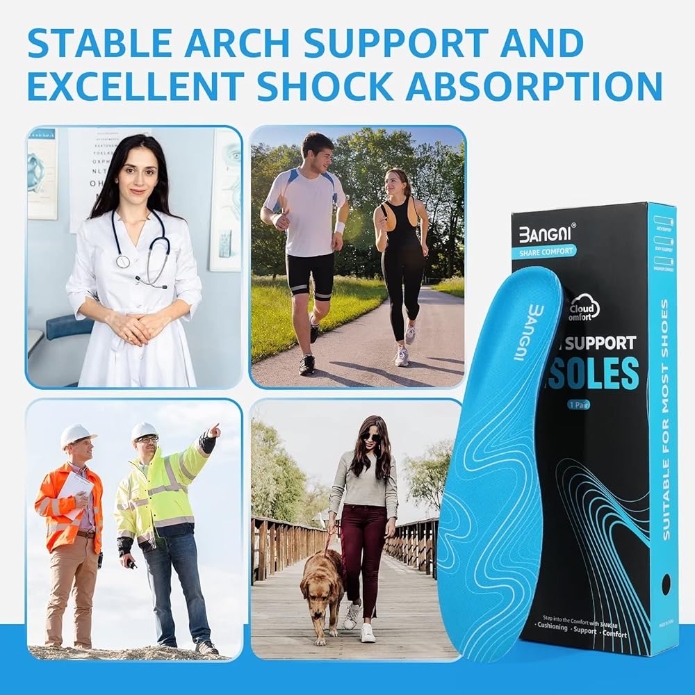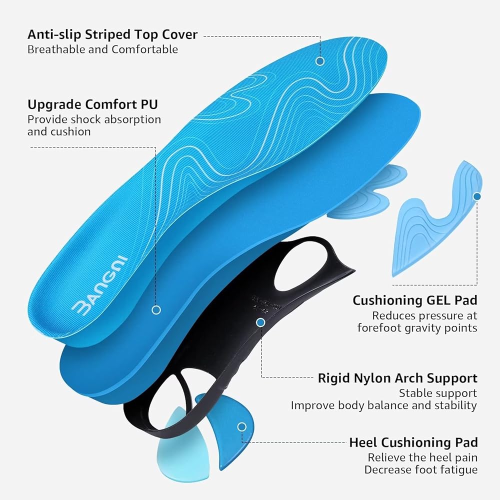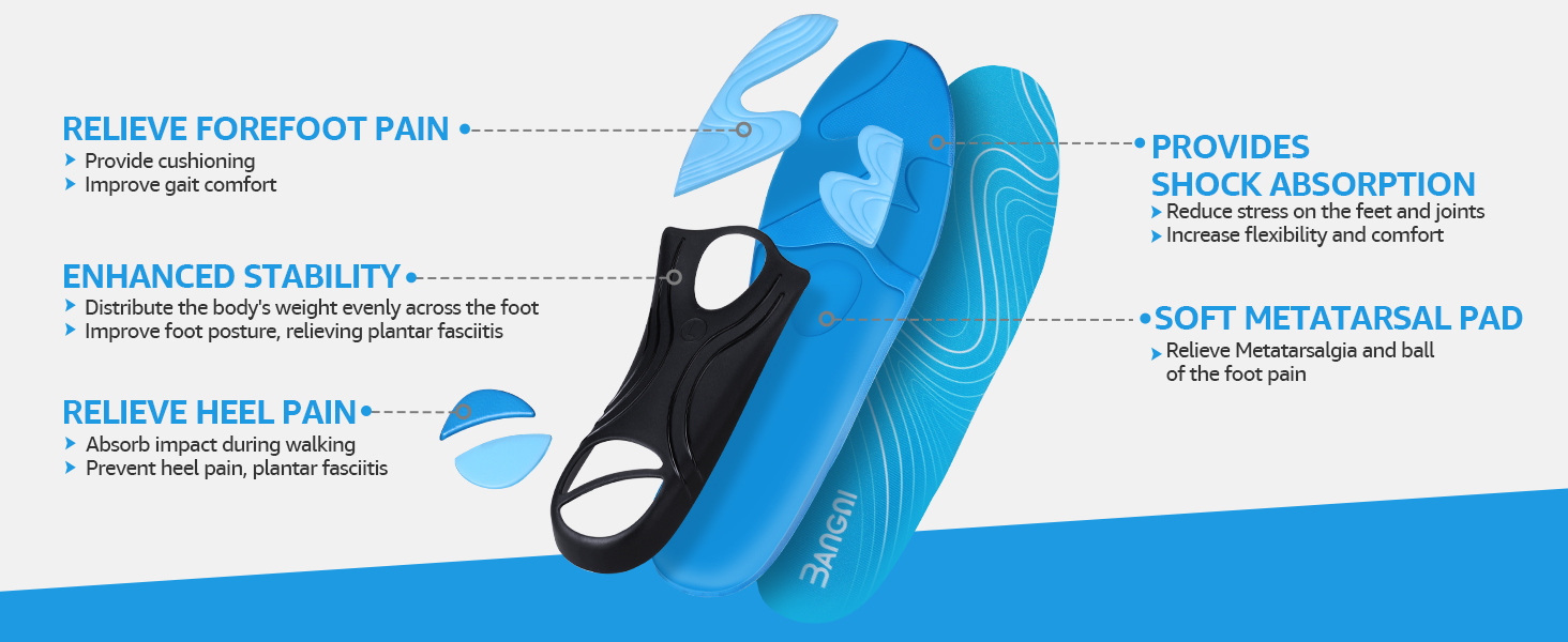 تخفيف الألم ومنعه: تدعم حشوات دعم قوس 3ANGNI الأقواس الطولية والعرضية للقدم، وتخفف الضغط على القدم والعمود الفقري، وتخفف بشكل فعال وتمنع التهاب اللفافة الأخمصية، والقدم المسطحة، وألم مشط القدم، والأقواس العالية، وألم الكعب، وألم القدم الأروح.
