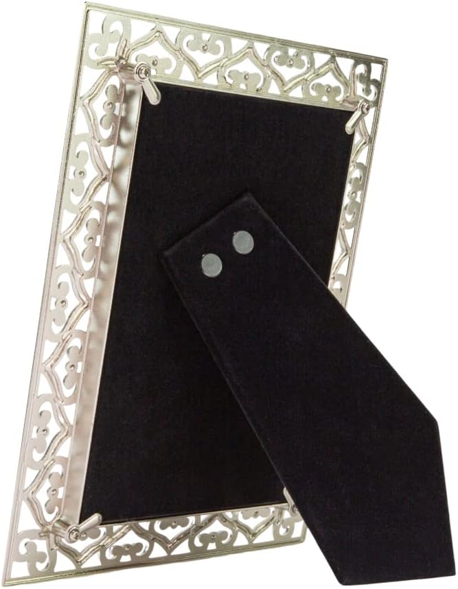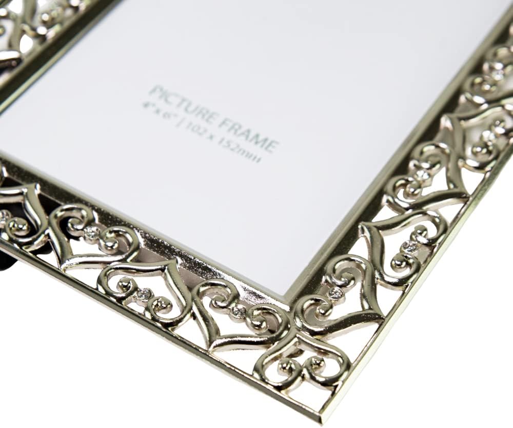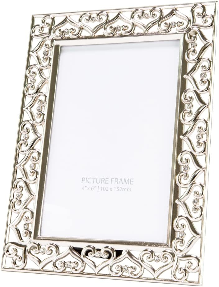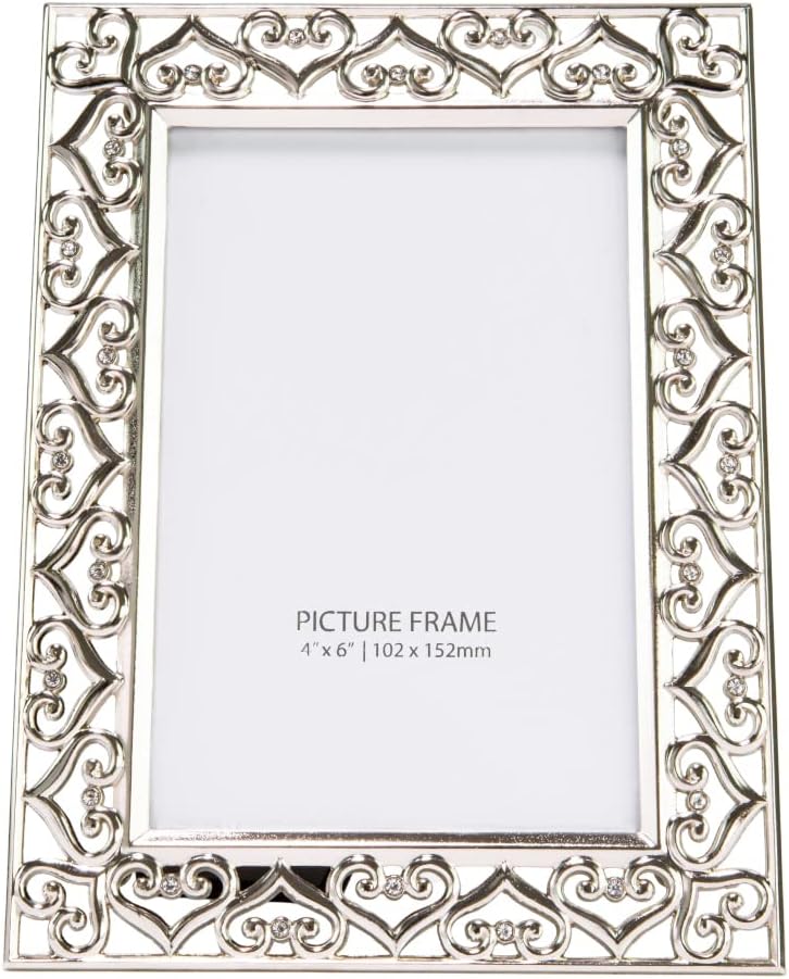 Contemporary and elegant high-quality rectangular polished nickel plated metal picture frame with surrounding border of linking hearts and small diamante glass crystals. This picture frame would make a beautiful gift for any occasion or to be used in the home or any business setting. This model can only be used free standing in either portrait or landscape, not suitable to be wall hung. This classic straight edged picture frame holds a single 4" x 6" photograph. Lacquer coated and tarnish resistant. Complete with luxury black velvet backing and clear glass front.