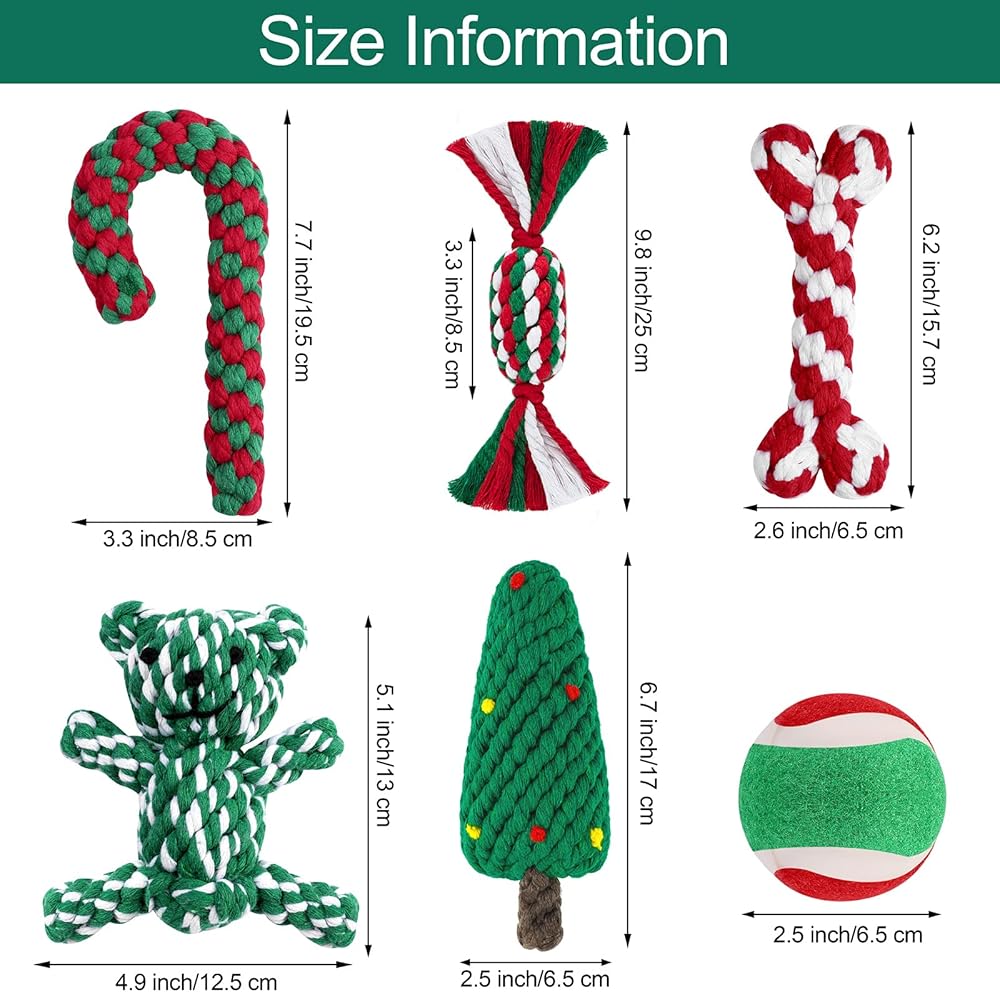 Package content: you will get 6 pieces of pet chew toys, which are designed in 6 different shapes, including 1 red, white and green candy, 1 bear, 1 Christmas cane, 1 red and white bone, 1 Christmas tree and 1 tennis ball, enough quantity for your dog‘s daily use and replacement