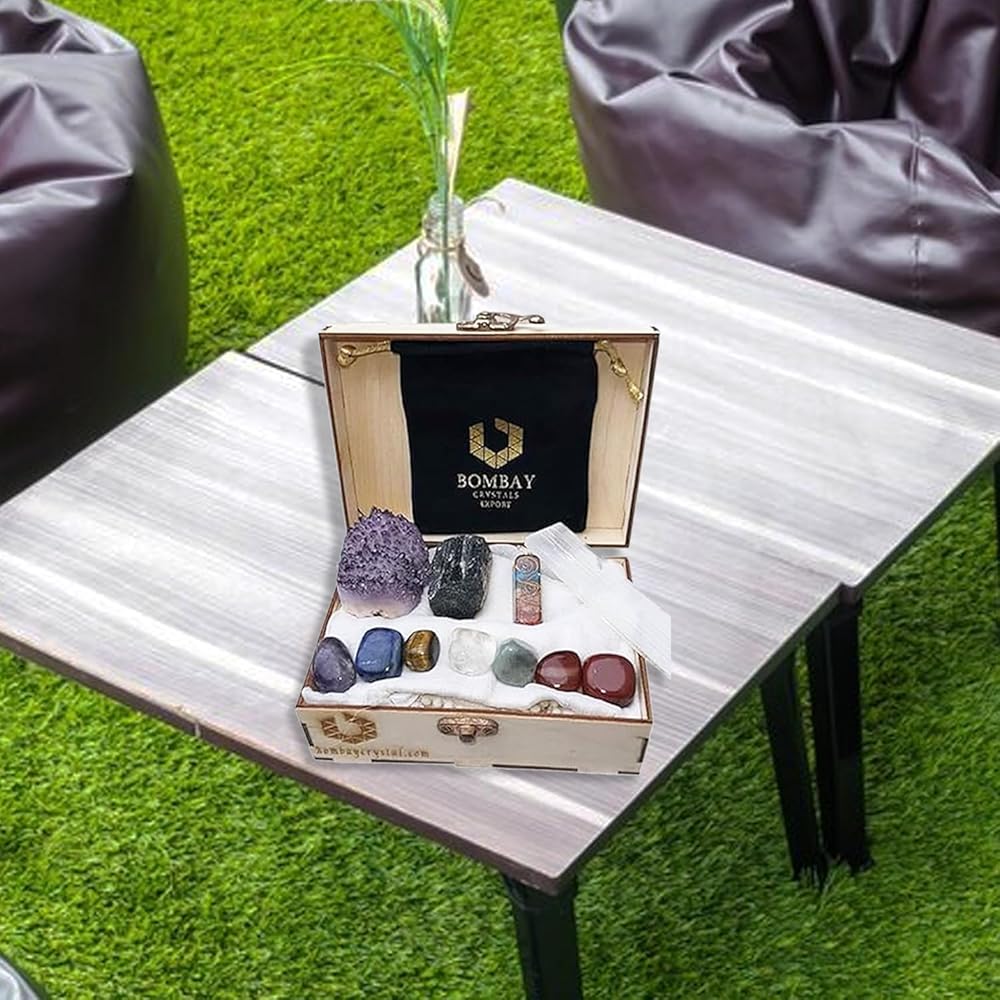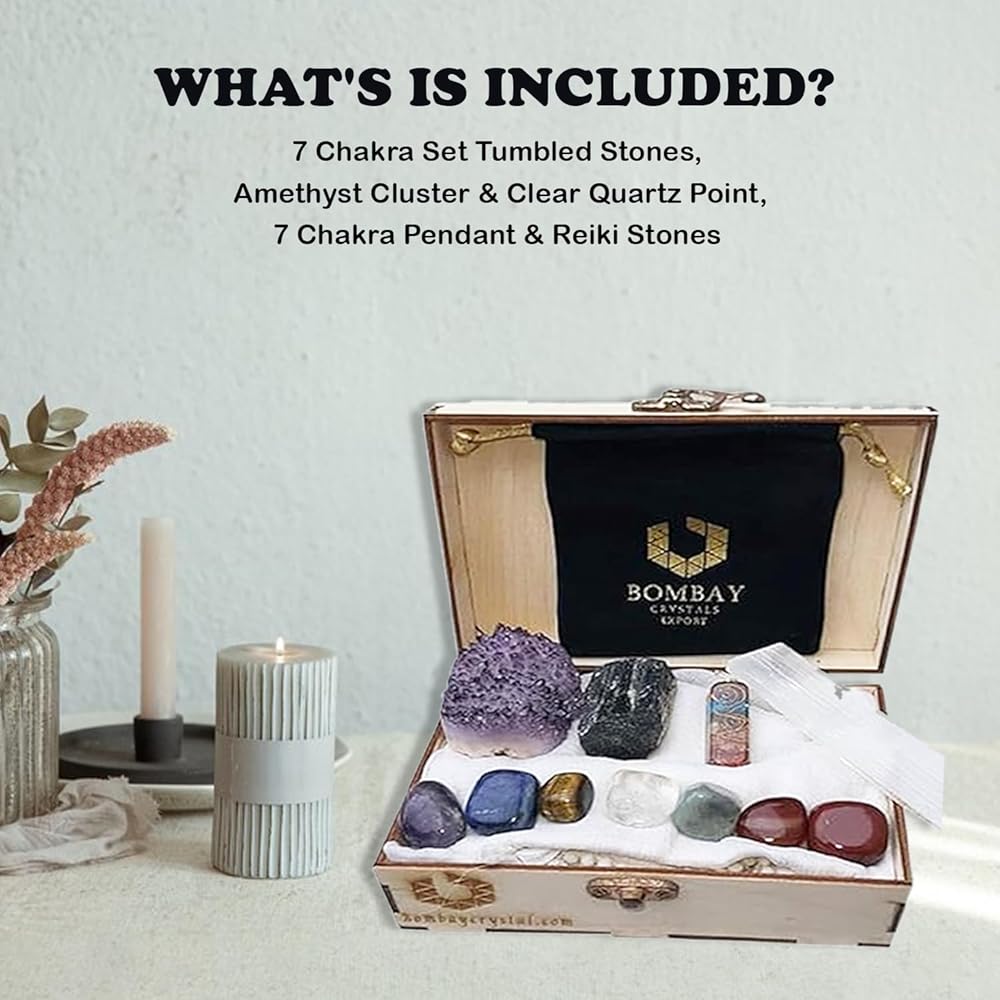 مجموعة أحجار علاجية طبيعية بنسبة 100%: نضمن توفير أحجار علاجية عالية الجودة منتقاة يدويًا للنساء. تتضمن مجموعة أحجار العلاج الكريستالية من بومباي - 7 أحجار شاكرا (كوارتز شفاف، جمشت، صوداليت، افينتورين أخضر، سيترين، عقيق، يشب أحمر)، كريستال بندول شاكرا السبعة، نقطة كريستال شفافة، مجموعة الجمشت، حجر الكوارتز الوردي الخام.