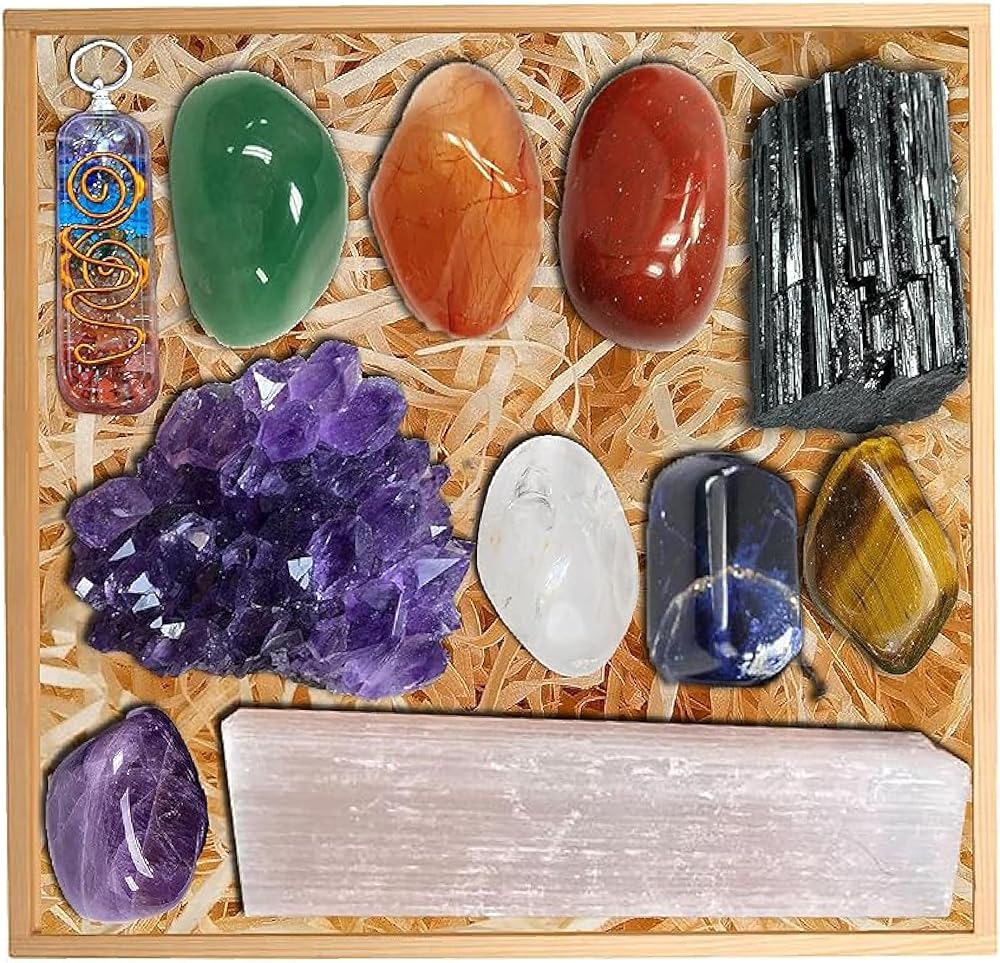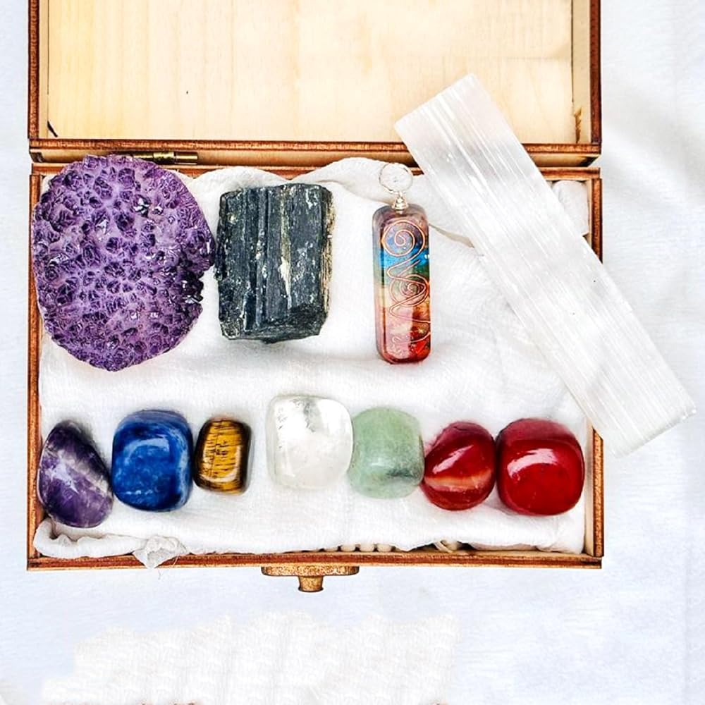 مجموعة احجار كريستال وعلاجية فاخرة في صندوق خشبي - مجموعة احجار شاكرا مكونة من 7 احجار شاكرا، كوارتز وردي، مجموعة جمشت، نقطة كوارتز شفافة، بندول شاكرا 7، احجار ريكي، هدايا روحية طبيعية للنساء