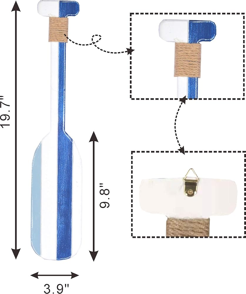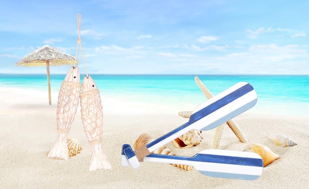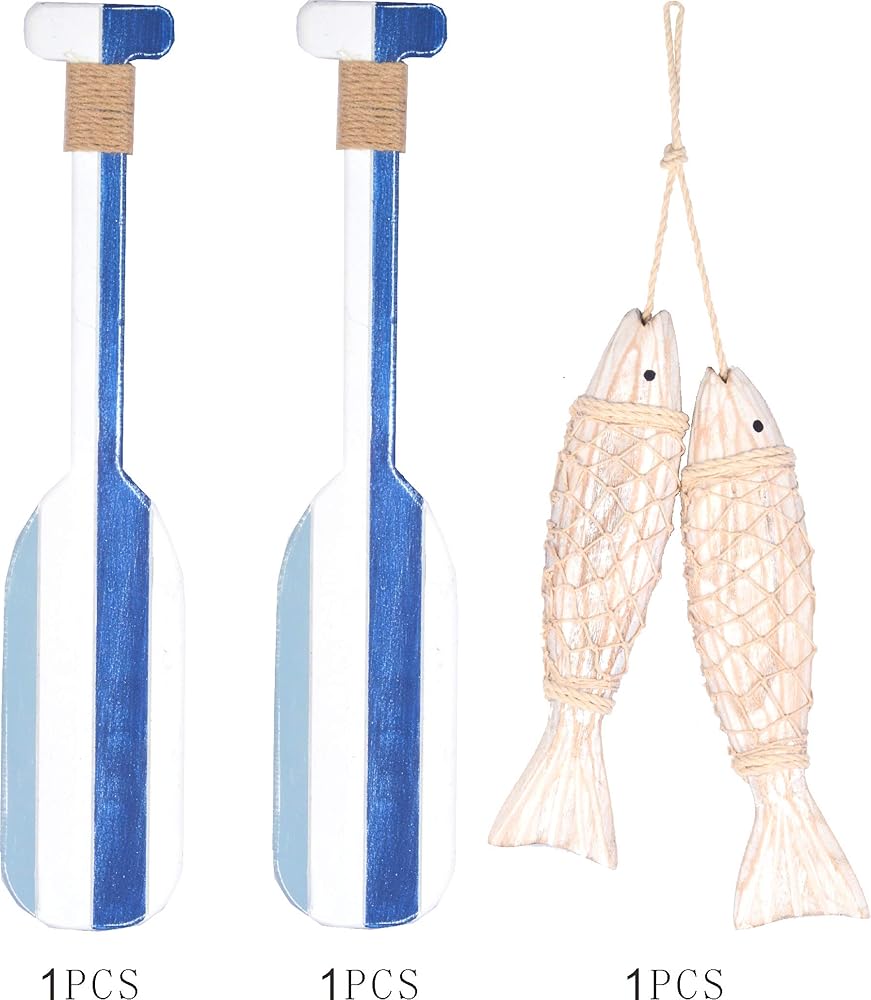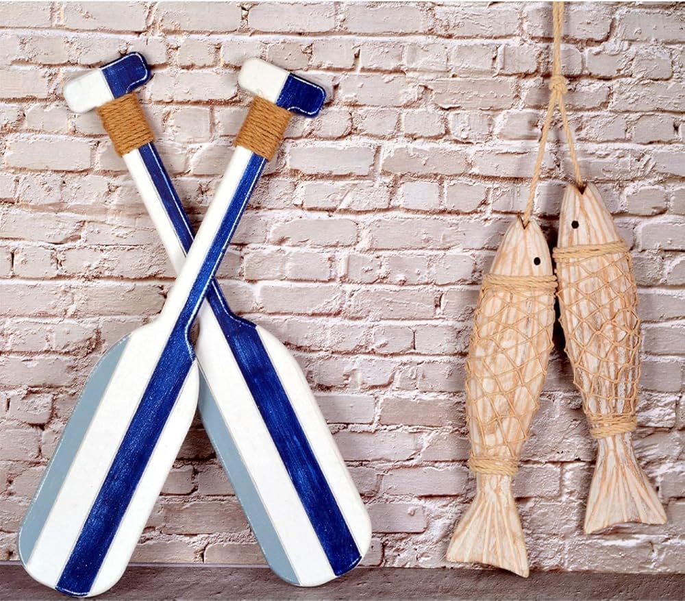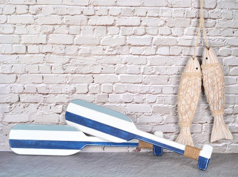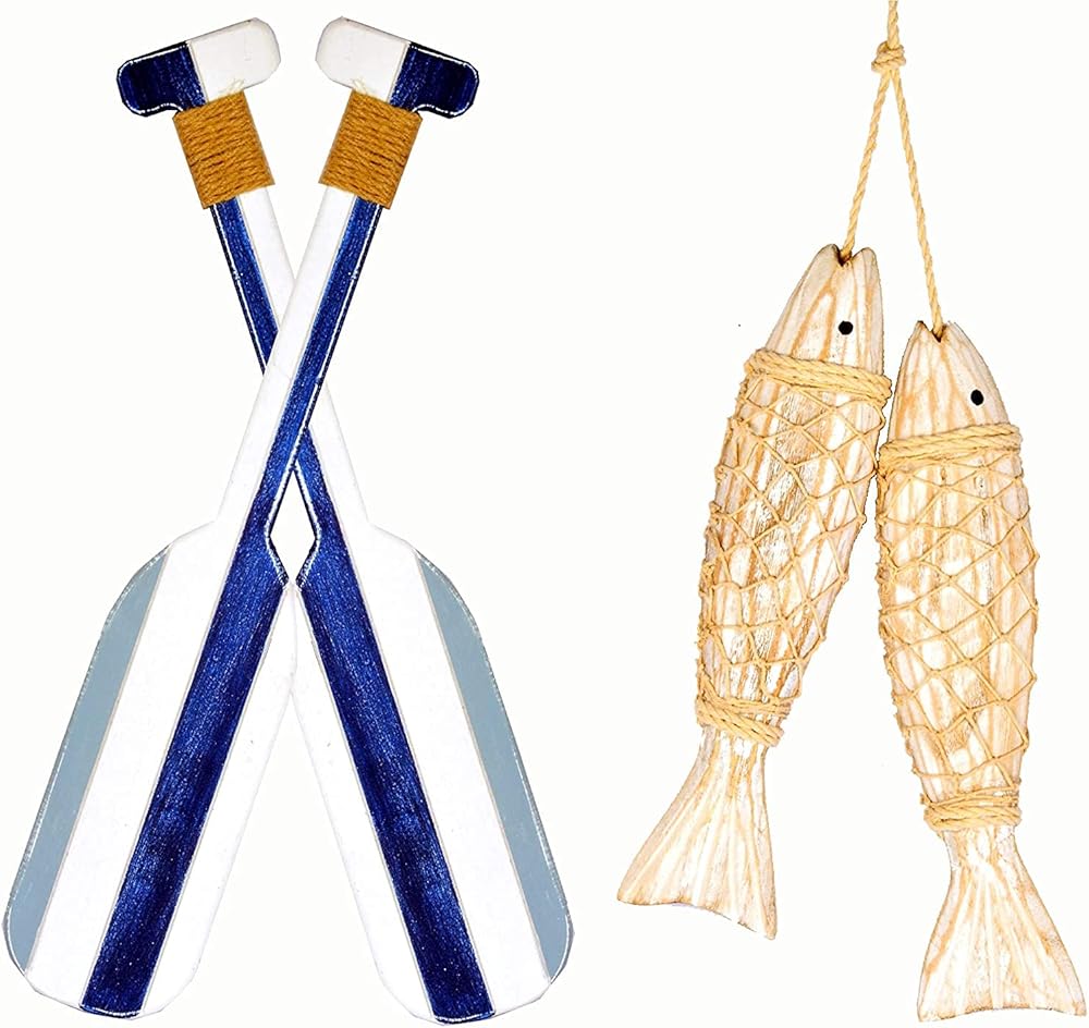 تم تصميم ديكور الأسماك الخشبية والمجاديف الخشبية البحرية بعناية ومهارة يدويًا على يد أرقى الحرفيين، مما يوضح ويظهر التفاصيل المصممة على الأسماك ولمسة نهائية من الجوت على المجاذيف.