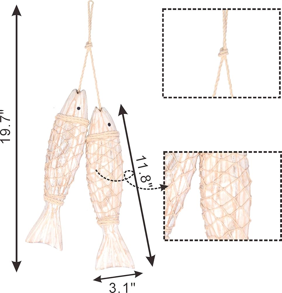 ديكور السمك الخشبي المزدوج - الأسماك خشبية أيضًا ويتم وضعها في شبكة مصنوعة من الحبال. الأسماك مطلية بشكل واقعي ويمكن استخدام الحبال لتعليق القطعة في أي مكان في المنزل