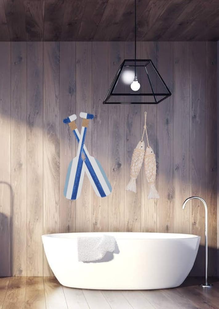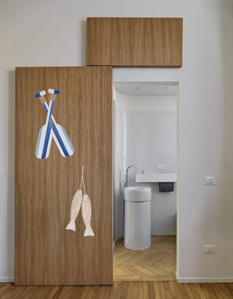 مجموعة حصرية من أربعة - مجموعة الديكور البحرية هي مجموعة حصرية من أربع قطع: مجداف وسمكة معلقة مزدوجة ريفية. جميعها قطع رائعة لتزيين الحمام على شكل مجداف وأسماك للتعليق في المنزل أو تقديمها كهدية لصديق