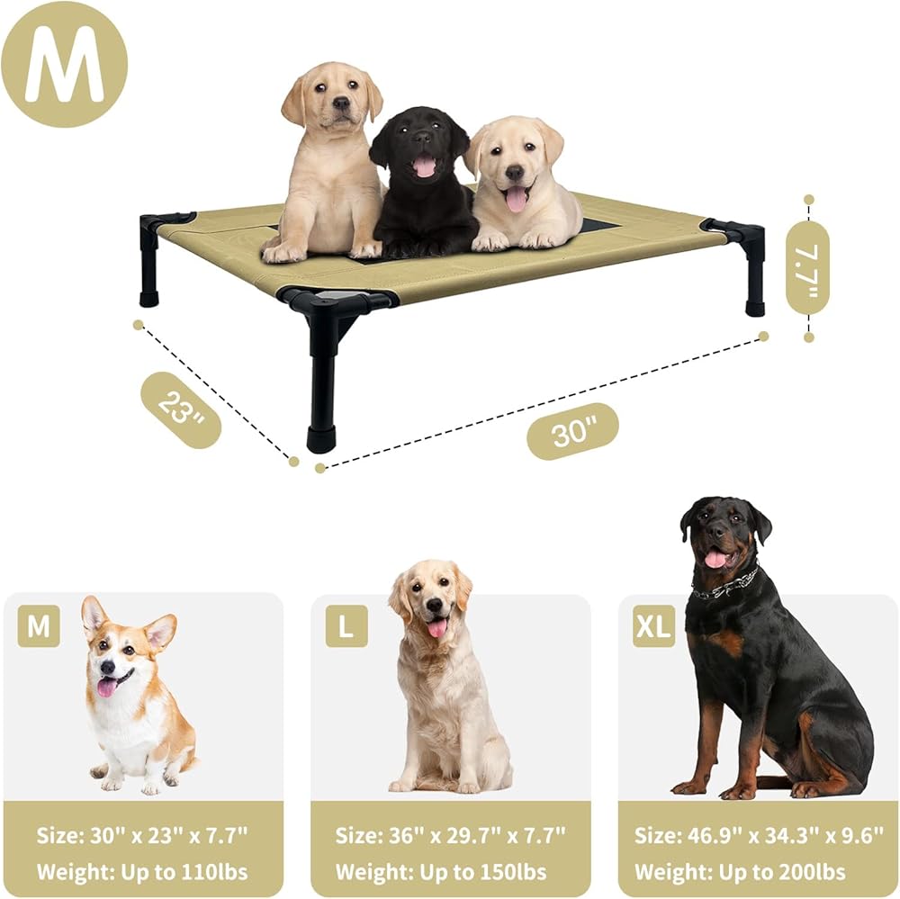 Medium lifted dog bed: 30"L x 23"W x 7.7"H (76x59x20 cm), fits up to 110 lbs(50kg). Suitable for all kinds of cats and small dogs, such as Chihuahua, Pug, Pomeranian, Little Teddy, etc.
