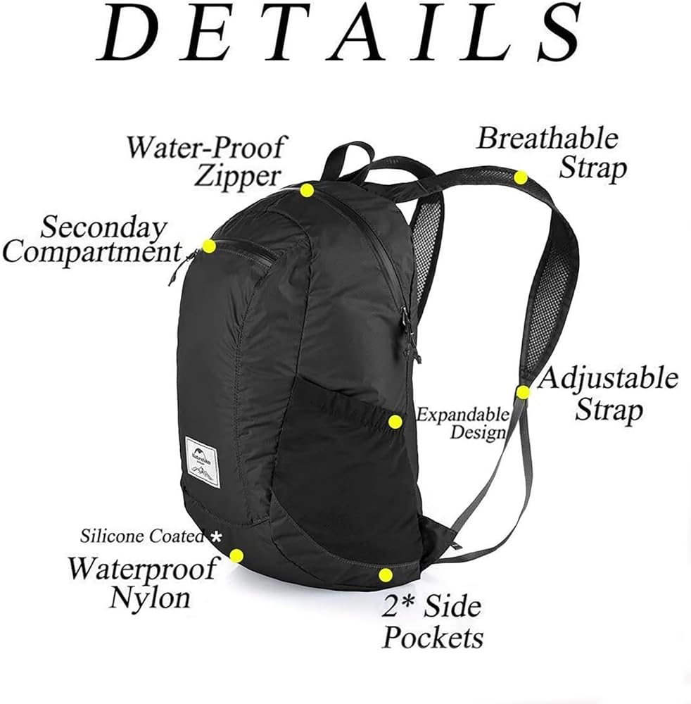 Lightweight and Roomy -- Despite weighing only 4.2oz, this 18L backpack is roomy enough to carry all your essentials when you're outdoors or traveling. It features an outer pocket and inner zippered pocket for quick access items, as well as two large side mesh pockets for water bottles or umbrellas. The backpack measures 17” x 10” when unfolded and collapses to 4.7” x 2.7” when folded.