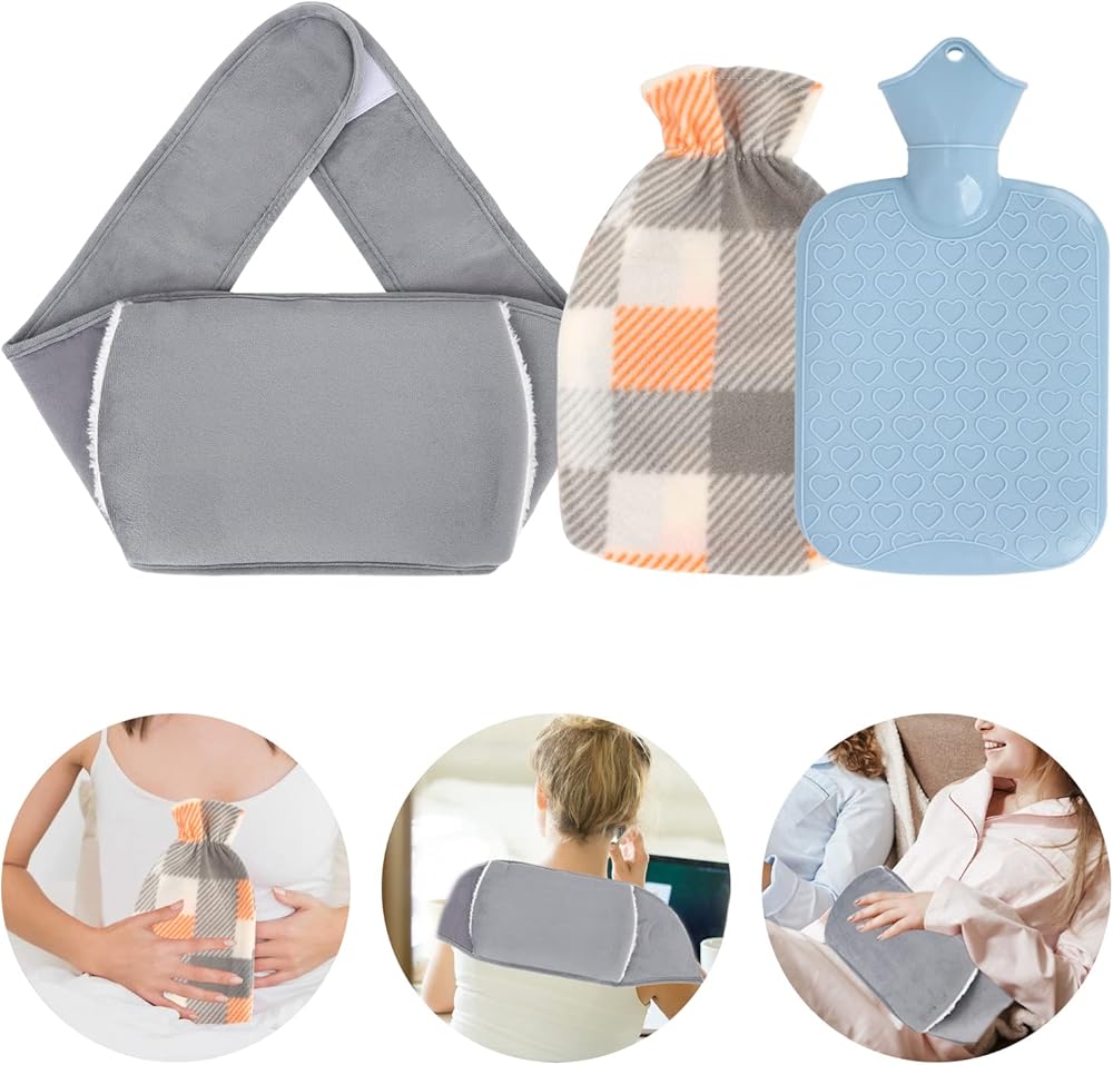 كيس ماء ساخن لزجاجة ماء دافئ مع غطاء، كيس ماء ساخن مع غطاء للخصر، مجموعة أكياس ماء ساخن دافئ من مادة PVC عالية الكثافة، حزام رمادي من القطيفة لتخفيف آلام التعب والساقين والرقبة والكتف والظهر