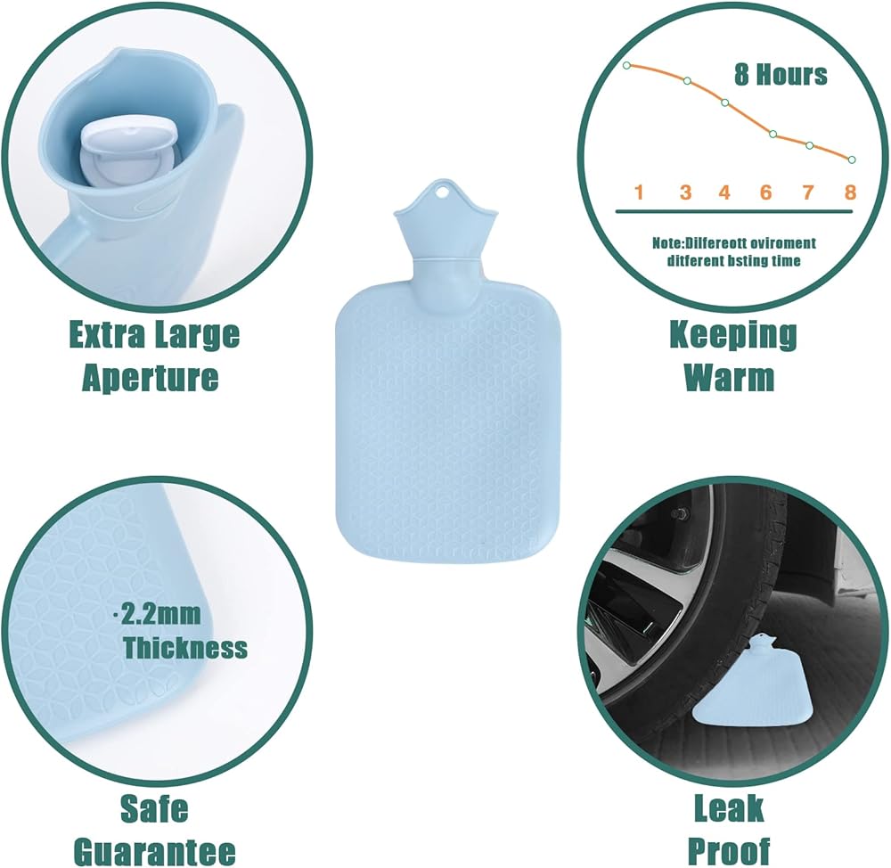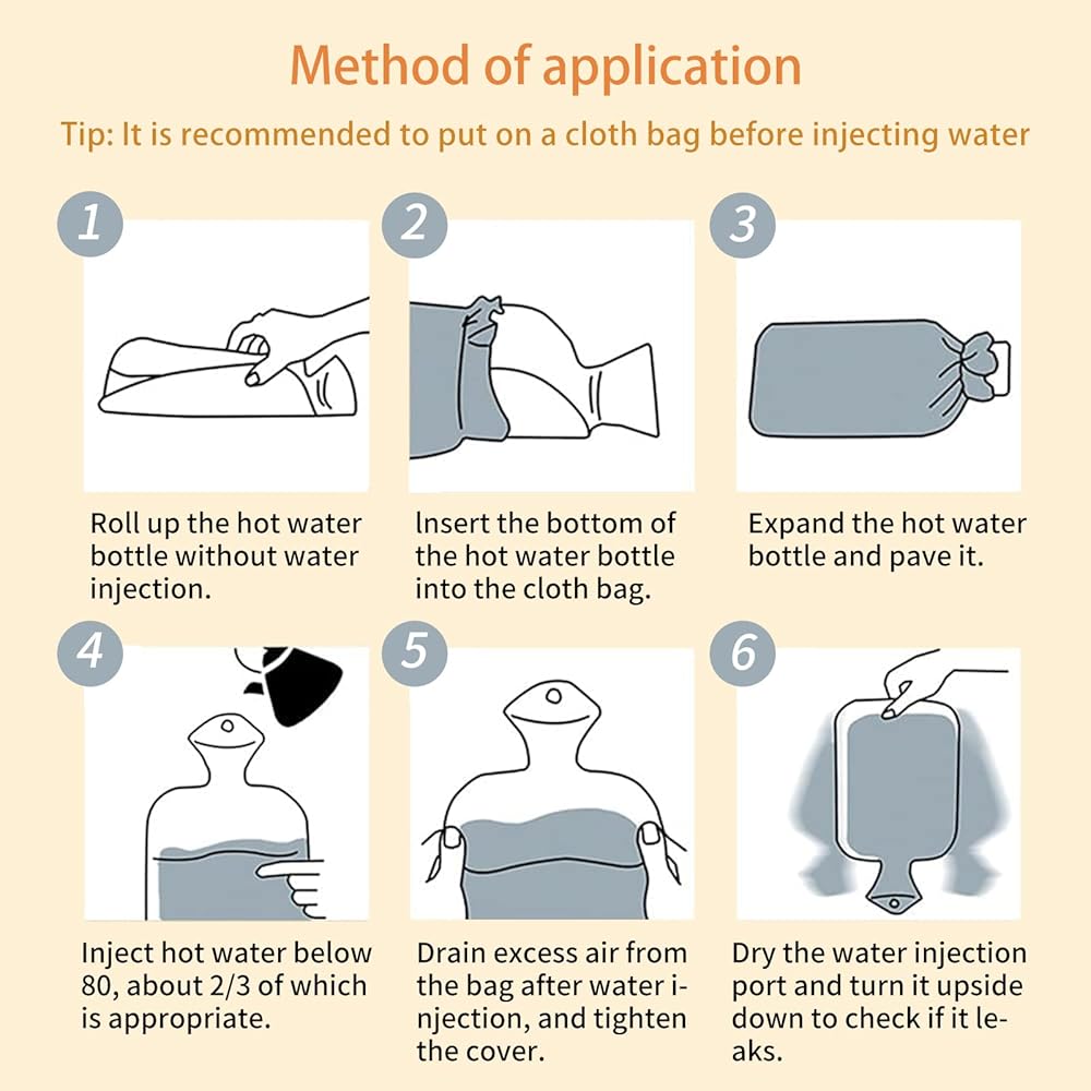 • Kind tips: For safe use, the hot water in the hot water bottle should not exceed 80 degrees, and it is recommended to fill it to 2/3. Please do not directly contact the skin with the hot water bottle filled with hot water to avoid burns. It is recommended that the hot water bottle be fitted with both the hot water bottle cover and the plush waist cover.