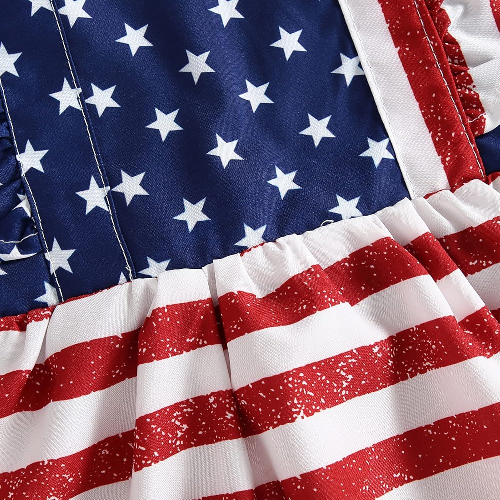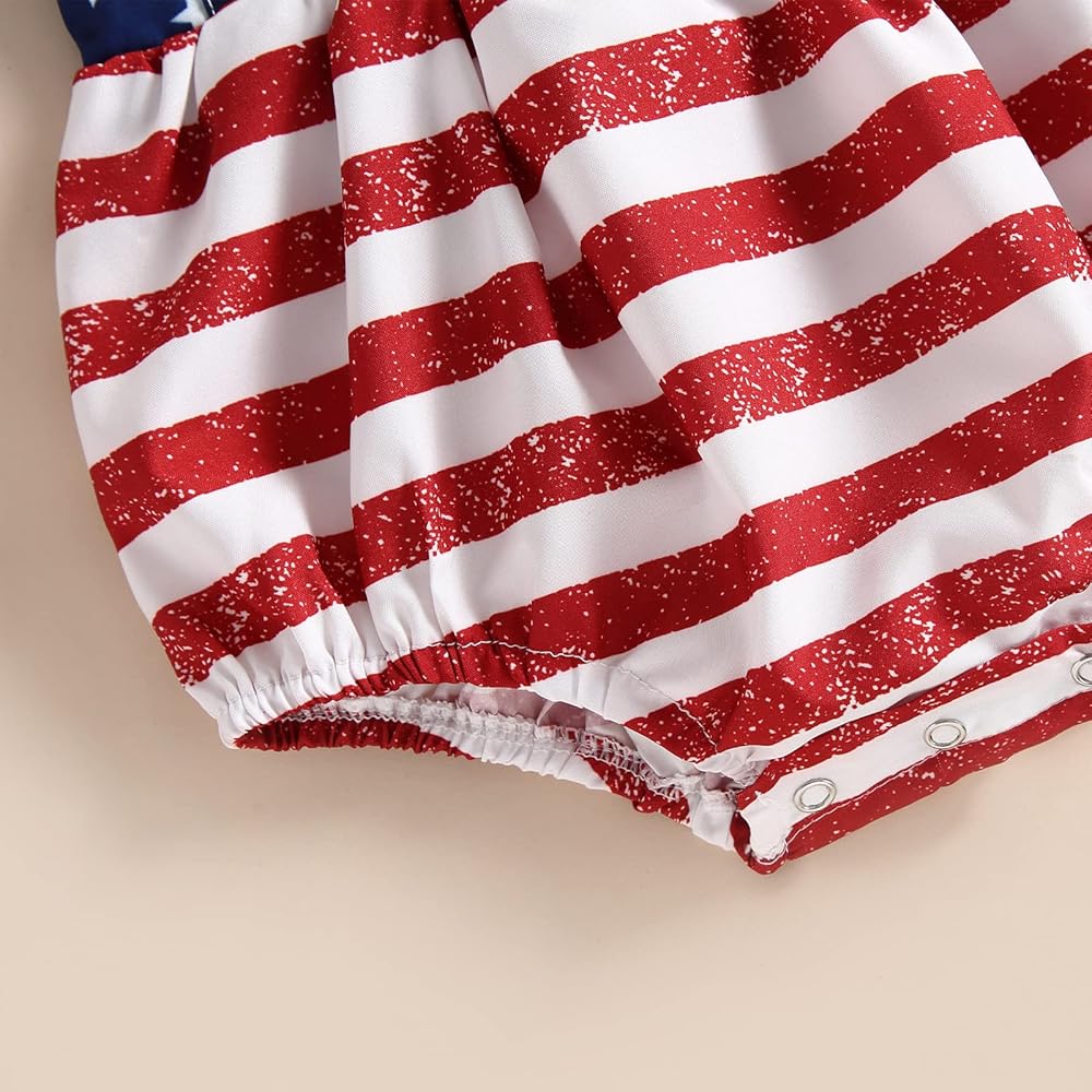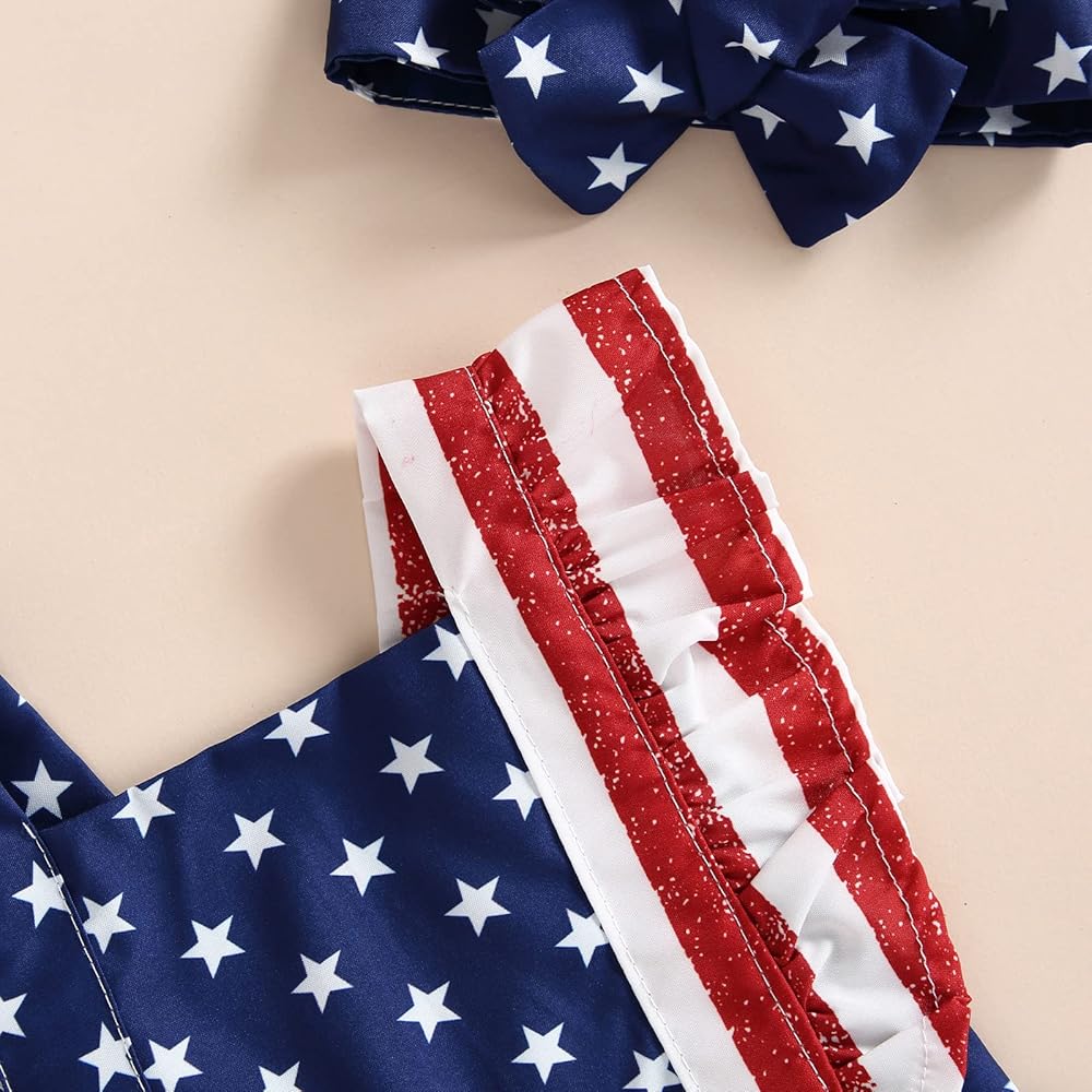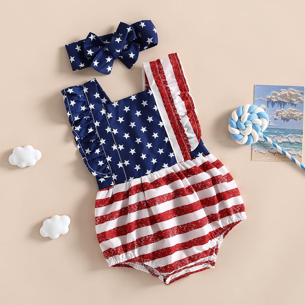 Baby Girl 4th of July Outfits, Ruffle Sleeve Backless Stars and Stripes Print Romper with Headband Set
