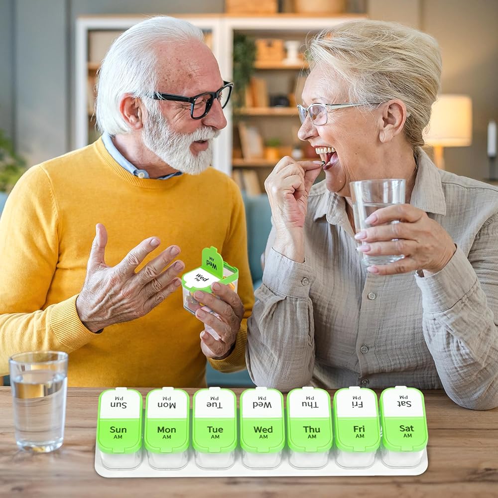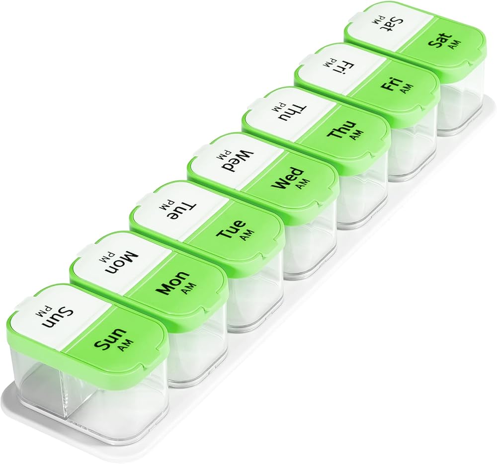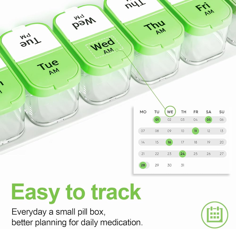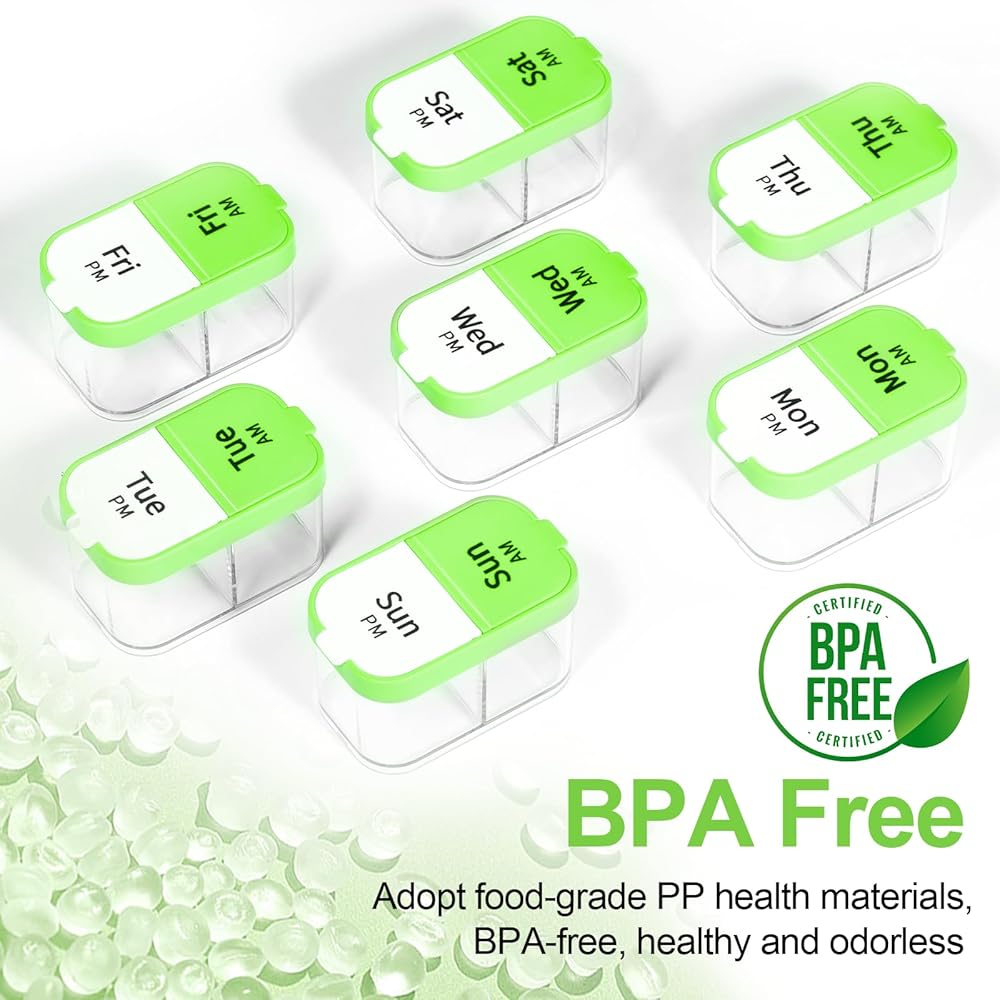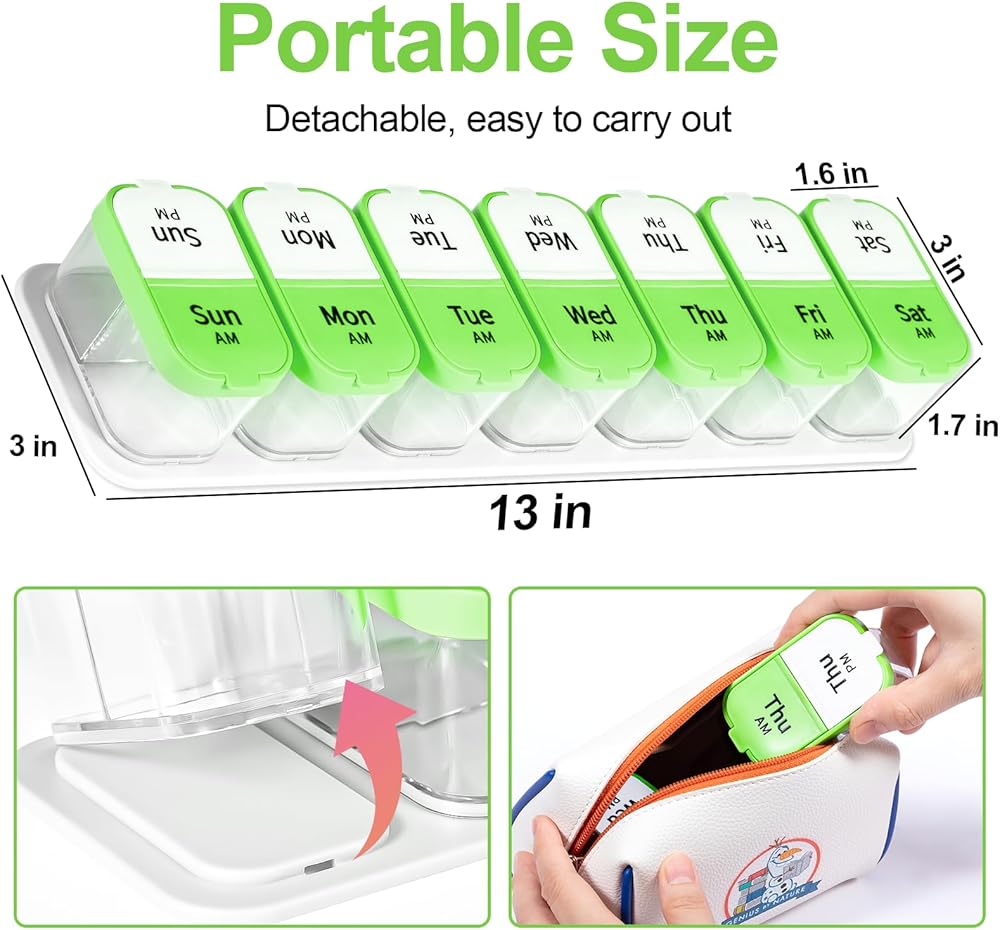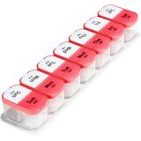 [سهل التتبع]: منظم حبوب الدواء الأسبوعي مرتين في اليوم، حجرة الصباح والمساء، يمكن أن يساعدك على التخطيط بشكل أفضل لأسبوع من الدواء، كل يوم يتوافق مع اللون، مادة شفافة، يمكنك رؤية مكملات الدواء بوضوح، لذلك لا نسيت تناول الدواء وإعادة ملئه في الوقت المناسب.