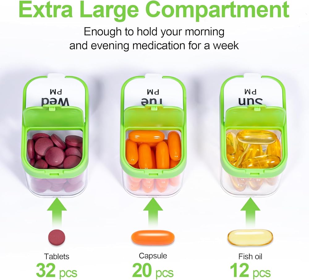 [مساحة كبيرة جدًا]: صندوق حبوب الدواء 7 أيام مع 14 مساحة كبيرة صباحًا ومساءً يمكنها حمل حبوب كبيرة مثل زيت كبد سمك القد، وهو ما يكفي لقيمة الدواء الأسبوعي، وهو مثالي للأشخاص الذين لديهم احتياجات دوائية يومية عالية.