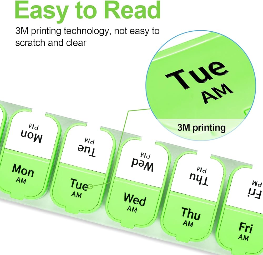 [سهل القراءة]: منظم صندوق حبوب الدواء اليومي - تعتمد الحروف تقنية الطباعة 3M، بعد اختبار الاستخدام 6000 مرة، يكون الخط واضحًا ولا يبلى بسهولة.