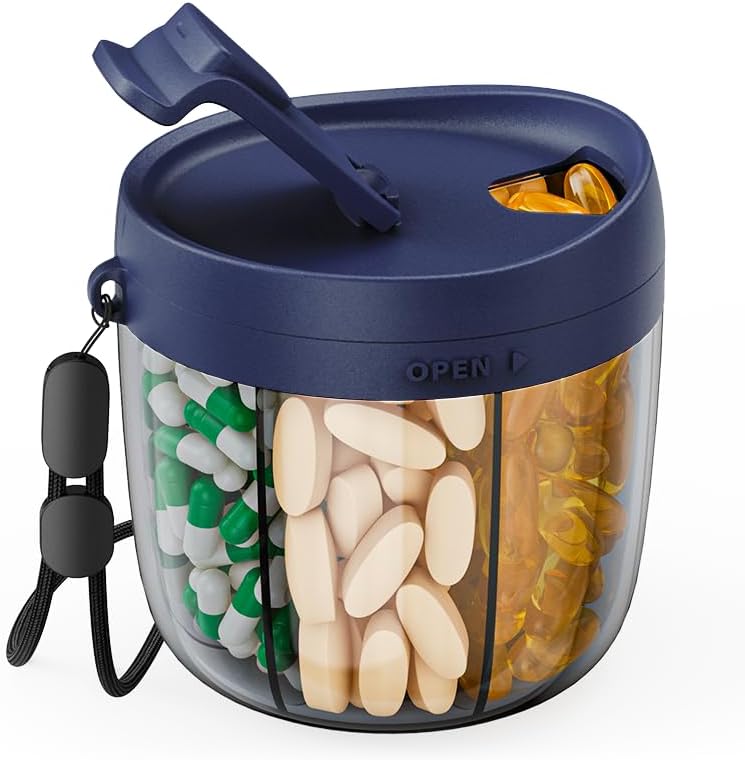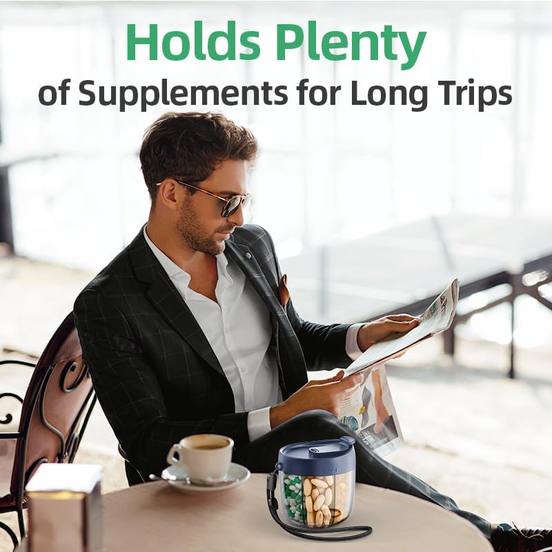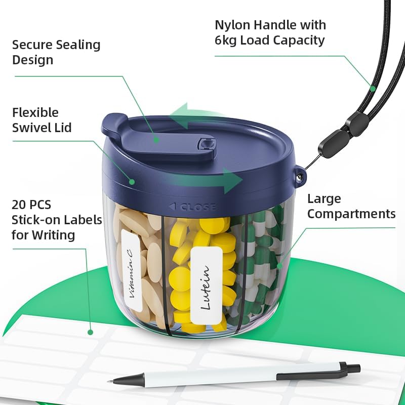 حامل حبوب محمول للسفر: منظم أدوية السفر مجهز بحزام مقبض من النايلون عالي الجودة بسعة تحميل 6 كجم، مما يجعل من السهل حمله. يأتي مع 20 ملصقًا فارغًا لمساعدتك على تسجيل تفاصيل حبوب الدواء وتناول حبوب الدواء في الوقت المحدد وفقًا للجرعة عند السفر. زجاجة منظم المكملات الغذائية هي مساعد السفر المثالي.