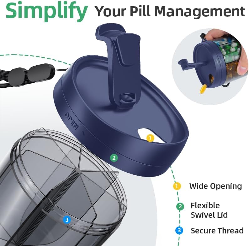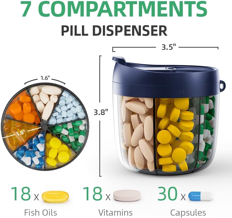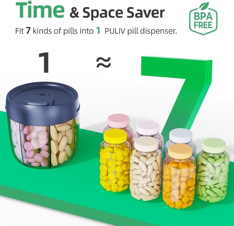 تحمل 7 مكملات في زجاجة واحدة: يتميز منظم حبوب الدواء الشهري من PULIV بـ 7 مساحات كبيرة، ويمكن لكل حجرة استيعاب ما يصل إلى 18 زيت سمك لتلبية احتياجاتك الصحية بسهولة. قم بتخزين 7 مكملات مختلفة في زجاجة حبوب واحدة. توفير الوقت والمساحة المثالي لك. (أبعاد الحجم: 3.81 بوصة ارتفاع × 3.54 بوصة قطر)