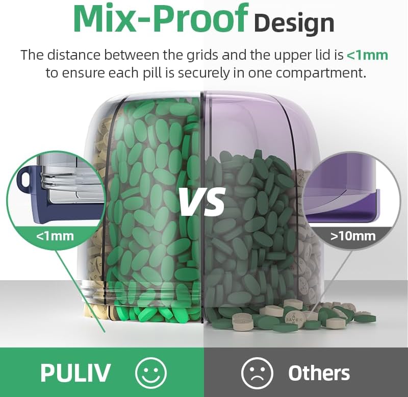 قل وداعًا لخلط الحبوب: منظم الأدوية المحمول PULIV بتصميم يجعل المسافة بين الشبكات والغطاء العلوي قريبة لضمان منع خلط الحبوب. توقف عن الانزعاج من خلط الحبوب عند صبها.