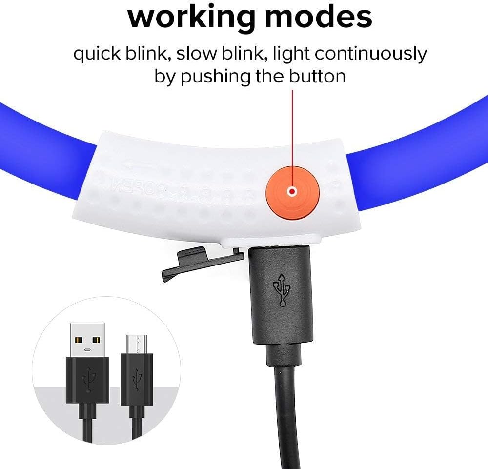 🔋قابل لإعادة الشحن عبر USB - يتميز طوق الكلاب المضيء الخاص بنا بتصميم قابل لإعادة الشحن، مما يضمن الشحن المريح باستخدام الأجهزة اليومية. مع وقت شحن لمدة ساعتين فقط، يوفر الطوق 8-10 ساعات من الوميض البطيء، و6-8 ساعات من الوميض السريع، و2-3 ساعات من التوهج الثابت.