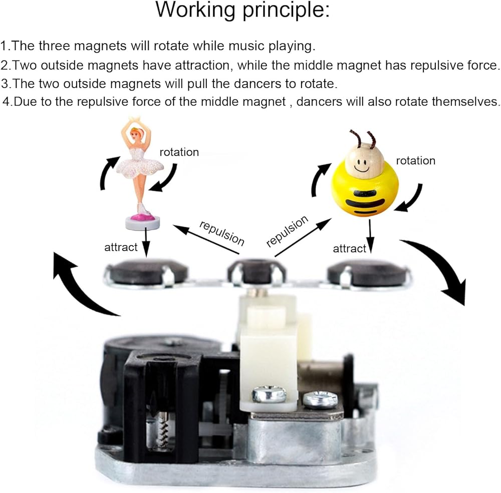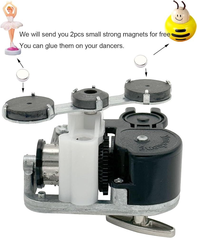 It is a 18 note Yunsheng wind up musical movement with three rotating magnets that use for either a Ballerina Jewelry Box or use for DIY your music boxes, it is very easy to setup. The sound power from spring, use the key to turn the spring tightly, then release and music will be playing. Usually it is used in a Ballerina Jewelry Box.