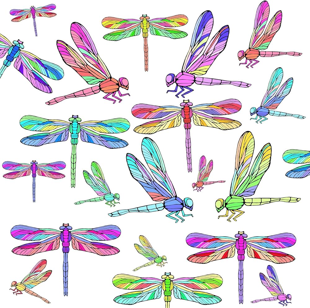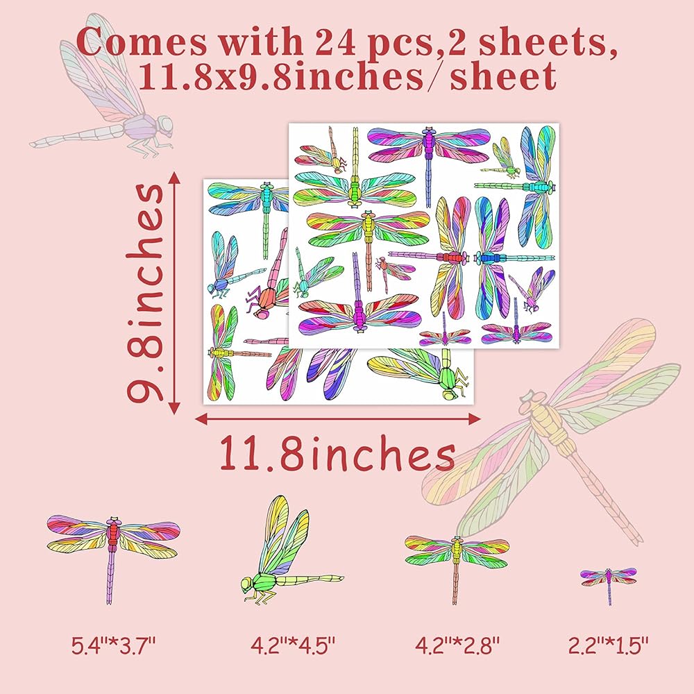 - المقاس: ورقتان مقاس 10 بوصة × 12 بوصة (25 سم × 30 سم)، 47 قطعة من ملصقات الحائط الجميلة الملونة على شكل اليعسوب