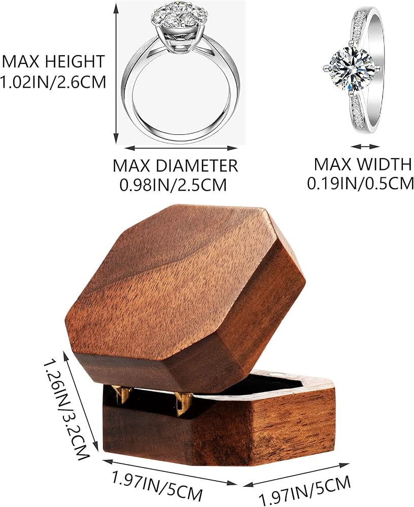 • الأبعاد الصغيرة: صندوق حلقي خشبي سهل الإمساك وهو نحيف وصغير بأبعاد خارجية مغلقة تبلغ 1.97 بوصة وسمك 1.26 بوصة. يمكنك إخفاؤه في الجيب ومفاجأة حبيبك.