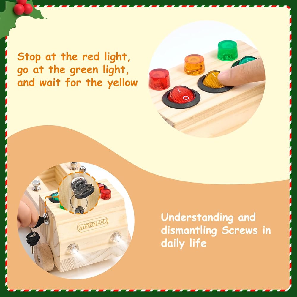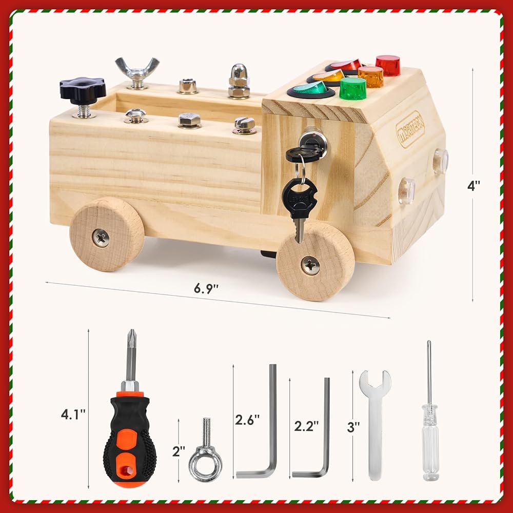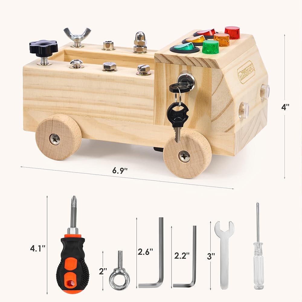 • لعبة مونتيسوري: لوحة مشغولة على شكل شاحنة ذات 4 عجلات مصممة بـ 3 مفاتيح مختلفة، كل مفتاح يتوافق مع لون مختلف من خرزات إضاءة LED، بالإضافة إلى 8 أنواع من البراغي التي يتم تركيبها بطرق مختلفة تتناسب مع مفك براغي الأطفال، لعبة صغيرة وجع وجميع البراغي الخاصة بك