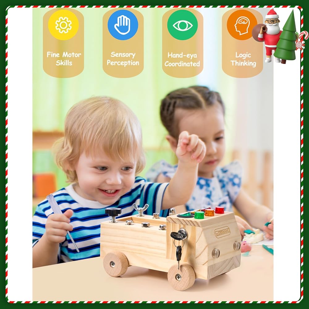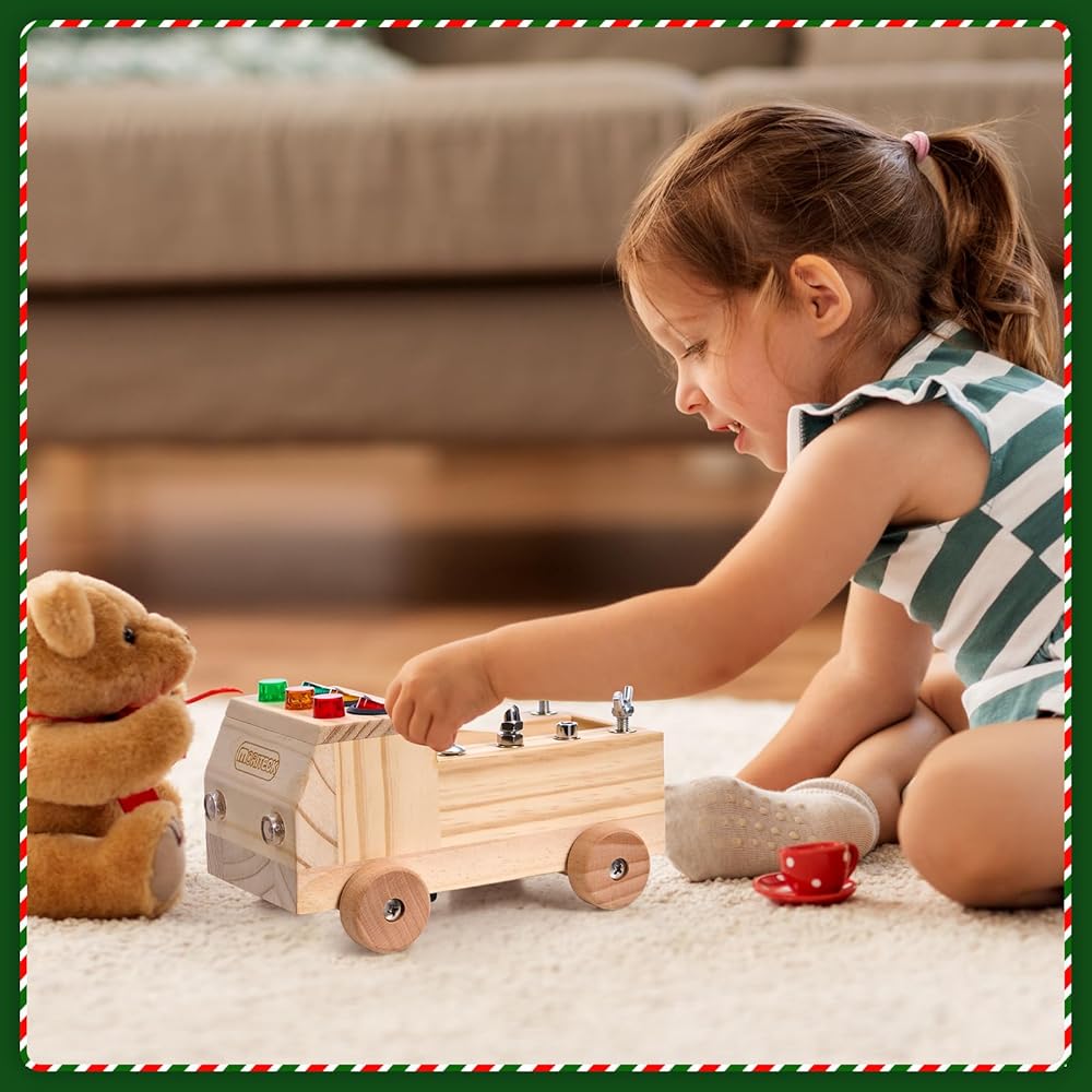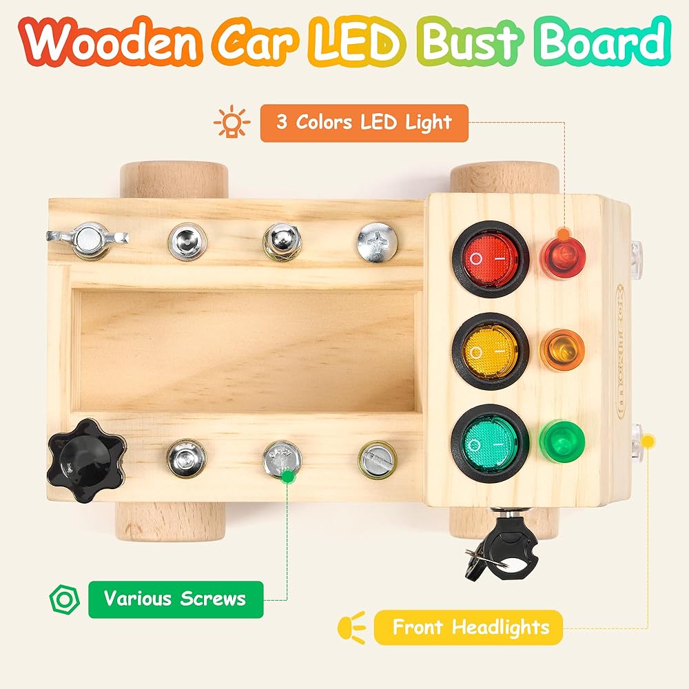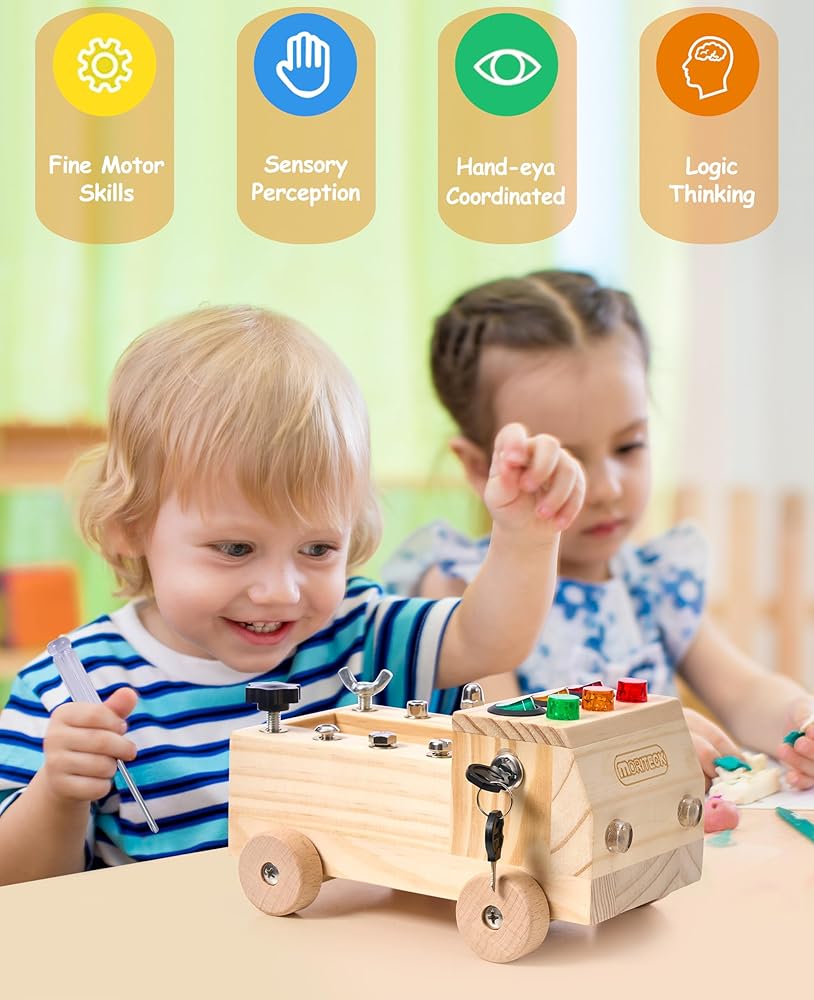 • لعبة مونتيسوري: لوحة مشغولة على شكل شاحنة ذات 4 عجلات مصممة بـ 3 مفاتيح مختلفة، كل مفتاح يتوافق مع لون مختلف من خرزات إضاءة LED، بالإضافة إلى 8 أنواع من البراغي التي يتم تركيبها بطرق مختلفة تتناسب مع مفك براغي الأطفال، لعبة صغيرة وجع وجميع البراغي الخاصة بك