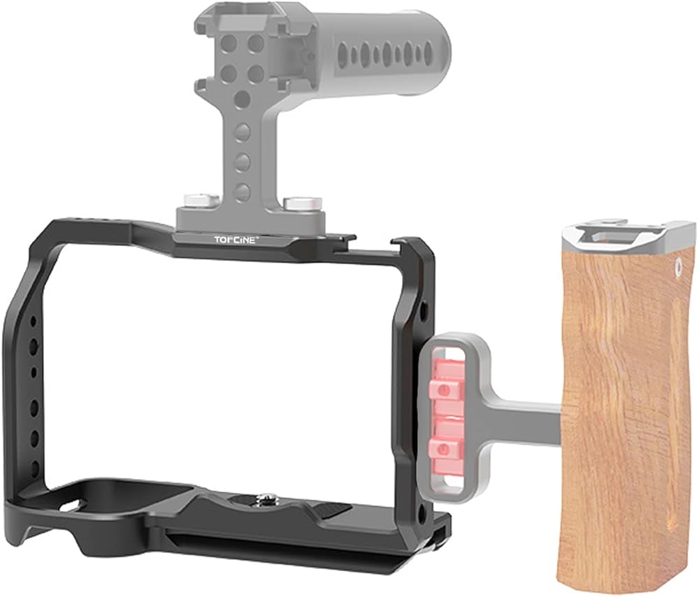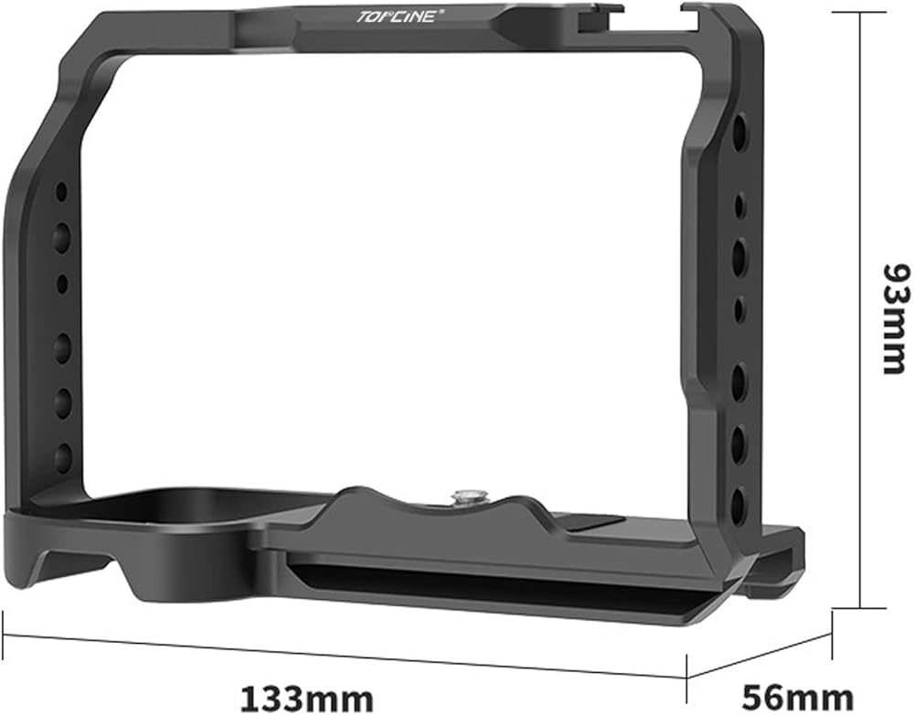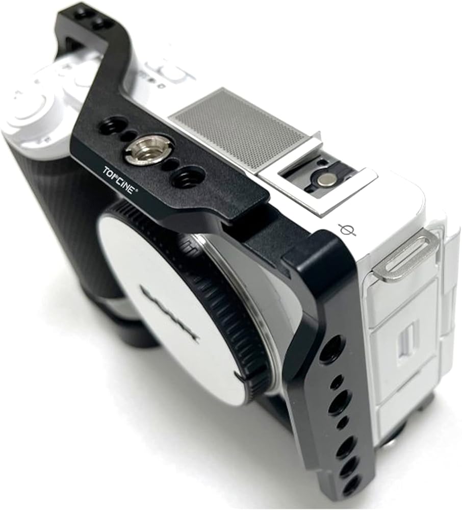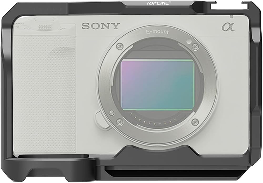 قفص كاميرا Topcine لقفص الكاميرا الكامل Sony Alpha ZV-E1 مع فتحات مترابطة متعددة 1/4 و3/8 ونقاط تحديد موضع ARRI، ولوحة سفلية سريعة الفك ويمكن تركيب الأحذية (قفص ZVE1)