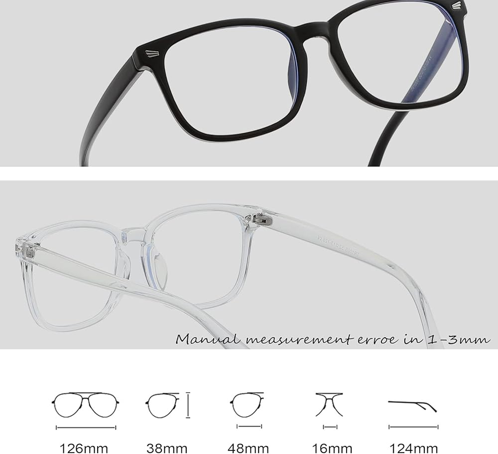 حجم المنتج - عرض العدسة: 48 ملم (1.88 انش)، ارتفاع العدسة: 38 ملم (1.49 انش)، عرض الأنف: 16 ملم (0.62 انش)، عرض الإطار: 126 ملم (4.96 انش)، طول الساق: 124 ملم (5.88 انش)، القياس اليدوي، خطأ 0.00-0.12 انش.
