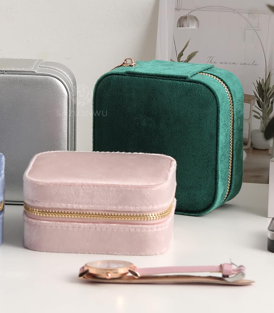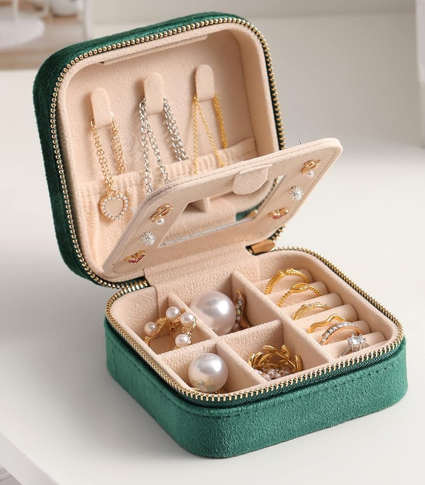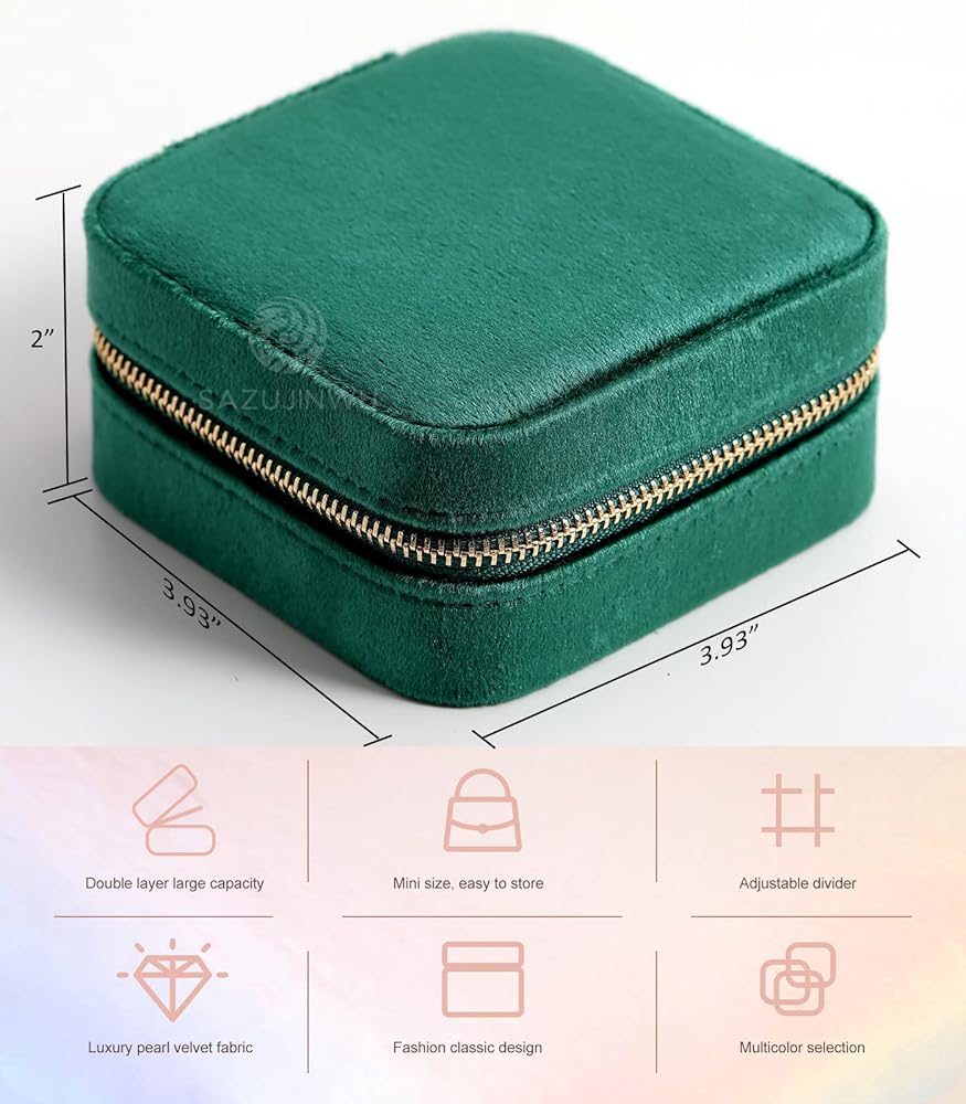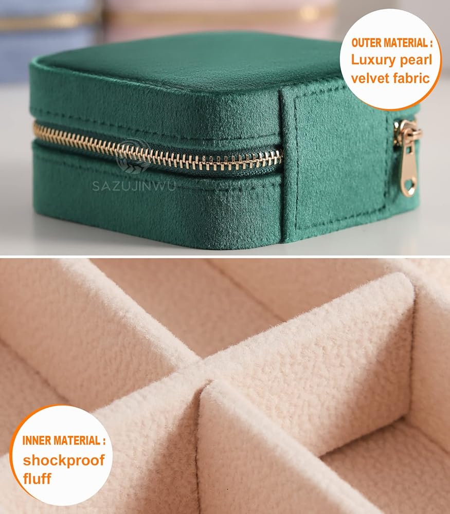 منظم صندوق مجوهرات السفر المخملي sazujinwu | حامل حلقات حلق أساسيات السفر، ومقصورة القلادة وفتحة الحلقة | حقيبة سفر مجوهرات مقاومة للخدش للنساء مع مرآة زمردية