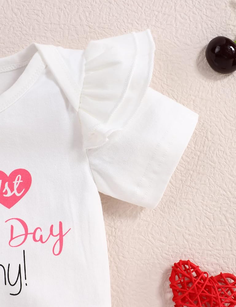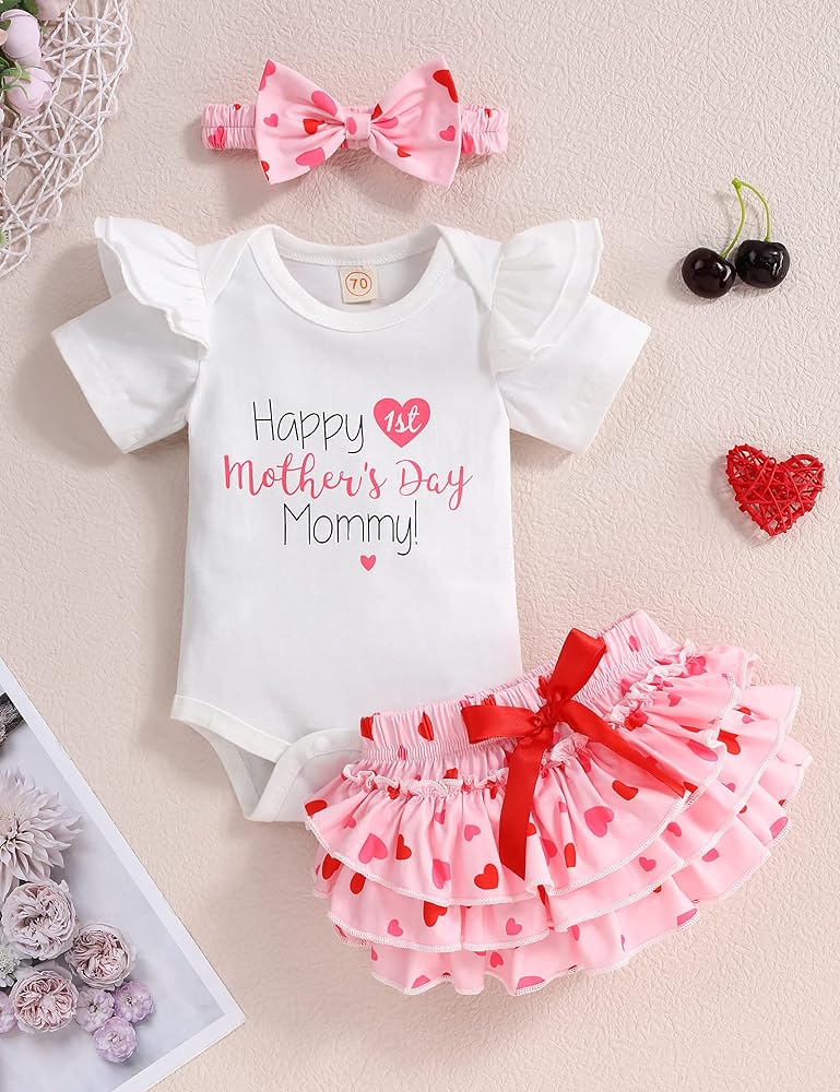 • Design: First Mother's Day baby outfit, short sleeve romper top with cute printed "Happy 1st mother's day" design + heart shorts with bow + heart headband.