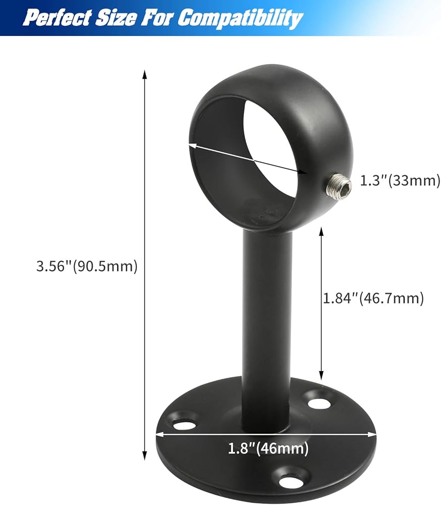 هناك خمسة مقاسات لتختار منها. مناسب تمامًا لقضبان الستائر مقاس 5/8 بوصة، و3/4 بوصة، و7/8 بوصة، و1 بوصة، و1 1/4 بوصة. الحد الأقصى لسعة الوزن لكل دعامة هو 11 رطلاً. الحد الأقصى لسعة الوزن لكل قوسين هو 22 رطلاً.