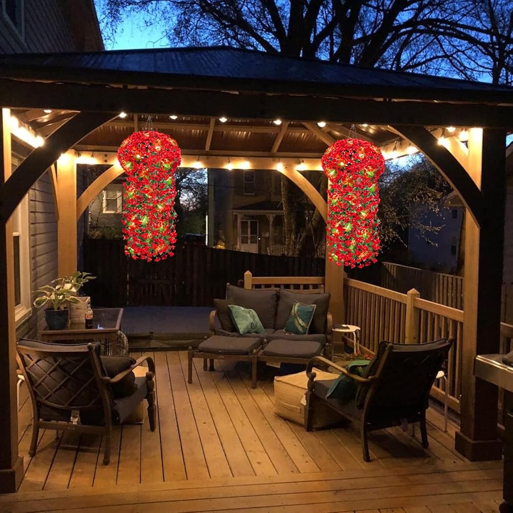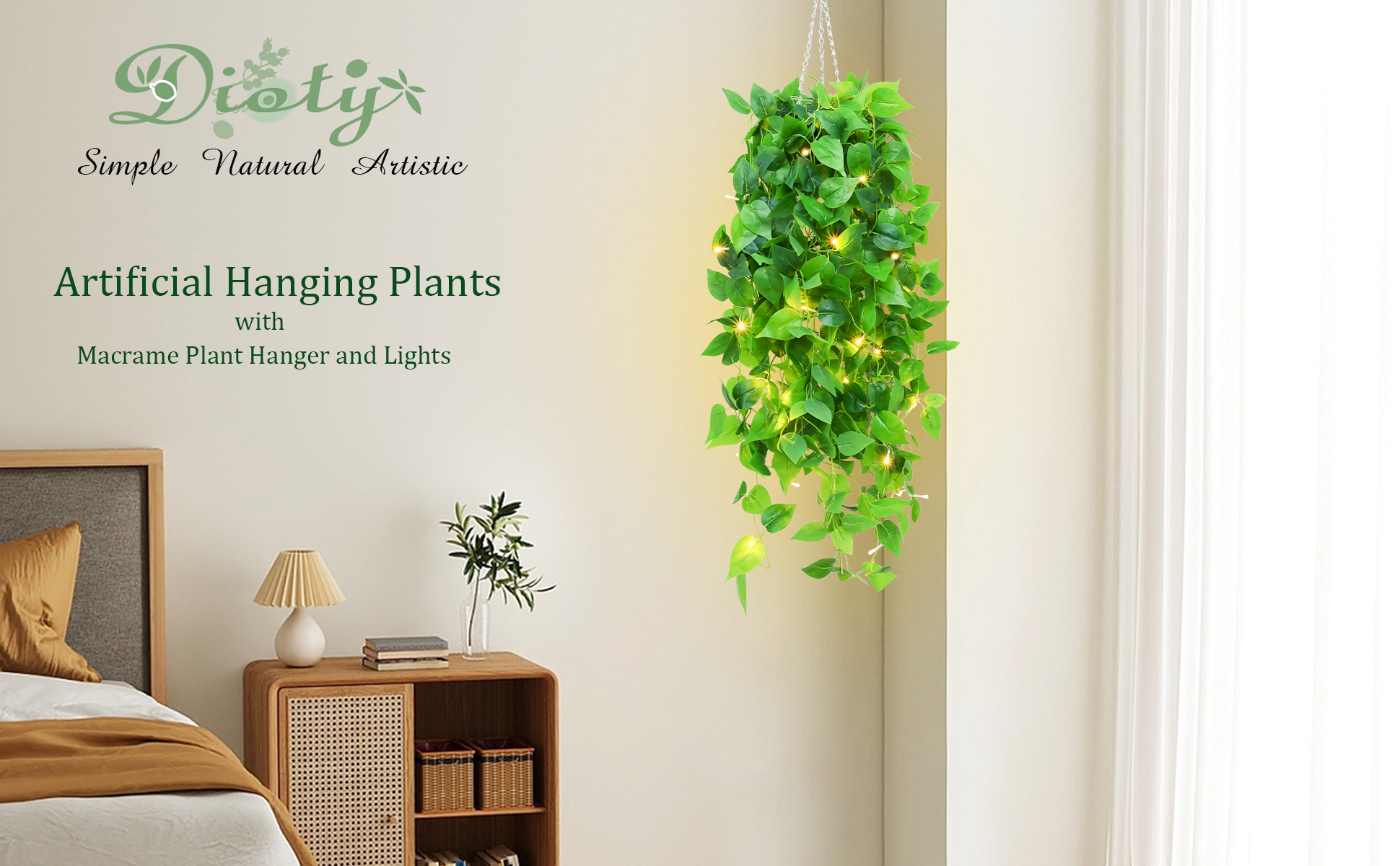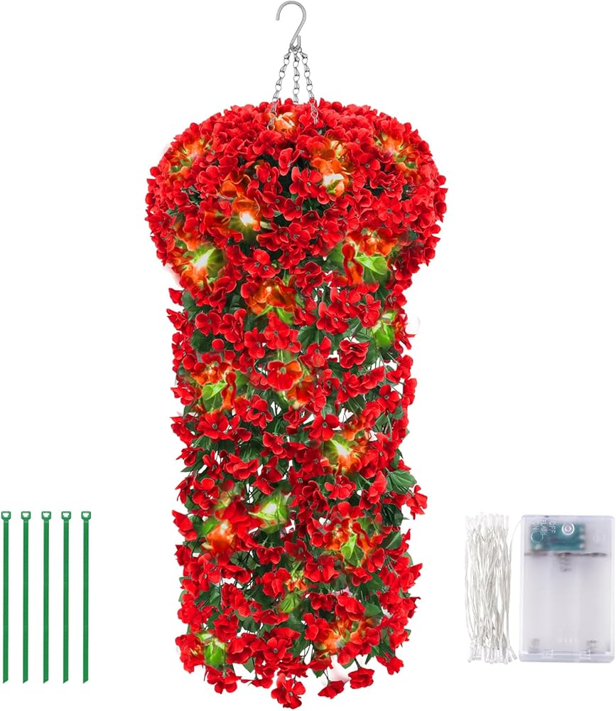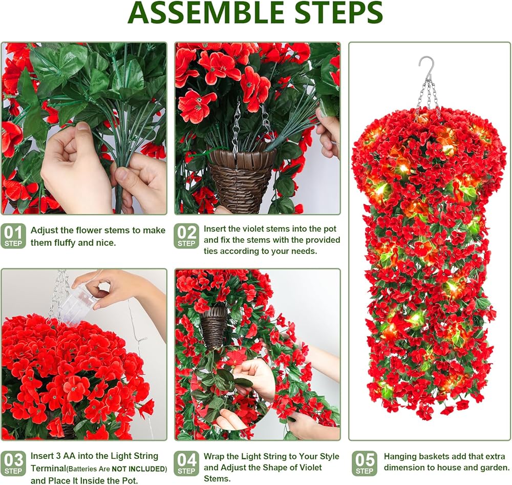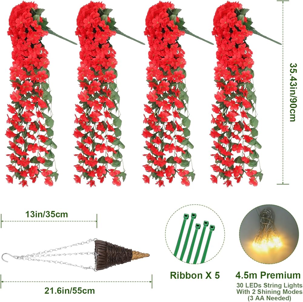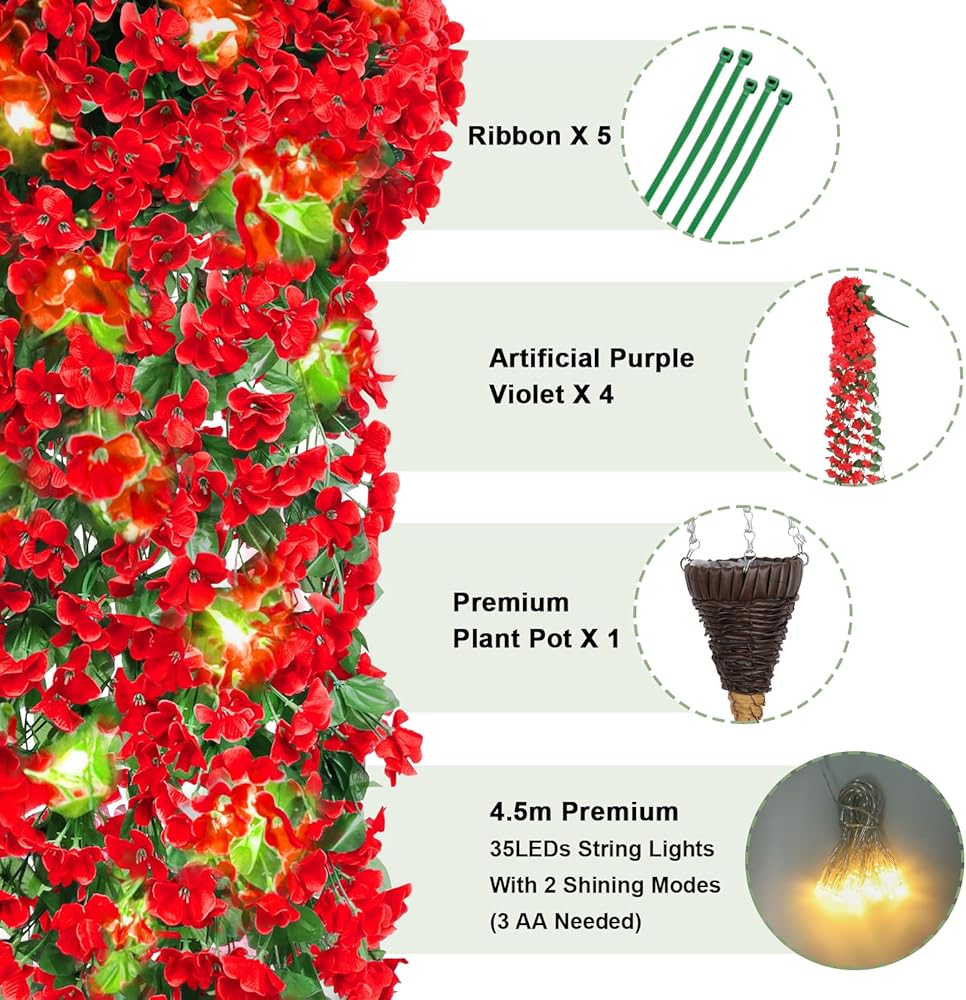 ميزات متعددة - شماعة نباتية عالية الجودة مصنوعة يدويًا نقية مقاس 21 بوصة/55 سم مع سلسلة معدنية وسلسلة إضاءة ممتازة بطول 4.5 متر مع 30 مصباح LED ساطع للغاية ووضعين مختلفين للإضاءة (تشغيل ثابت ووميض، تحتاج إلى 3AA ولا يتم تضمين AAs) يمكنك تزيين النباتات المعلقة المزيفة بأسلوبك الفريد ومزيجك المثالي. تأثير الإضاءة الجميل يمنحك تأثيرًا بصريًا مذهلاً مختلفًا تمامًا في الليل.