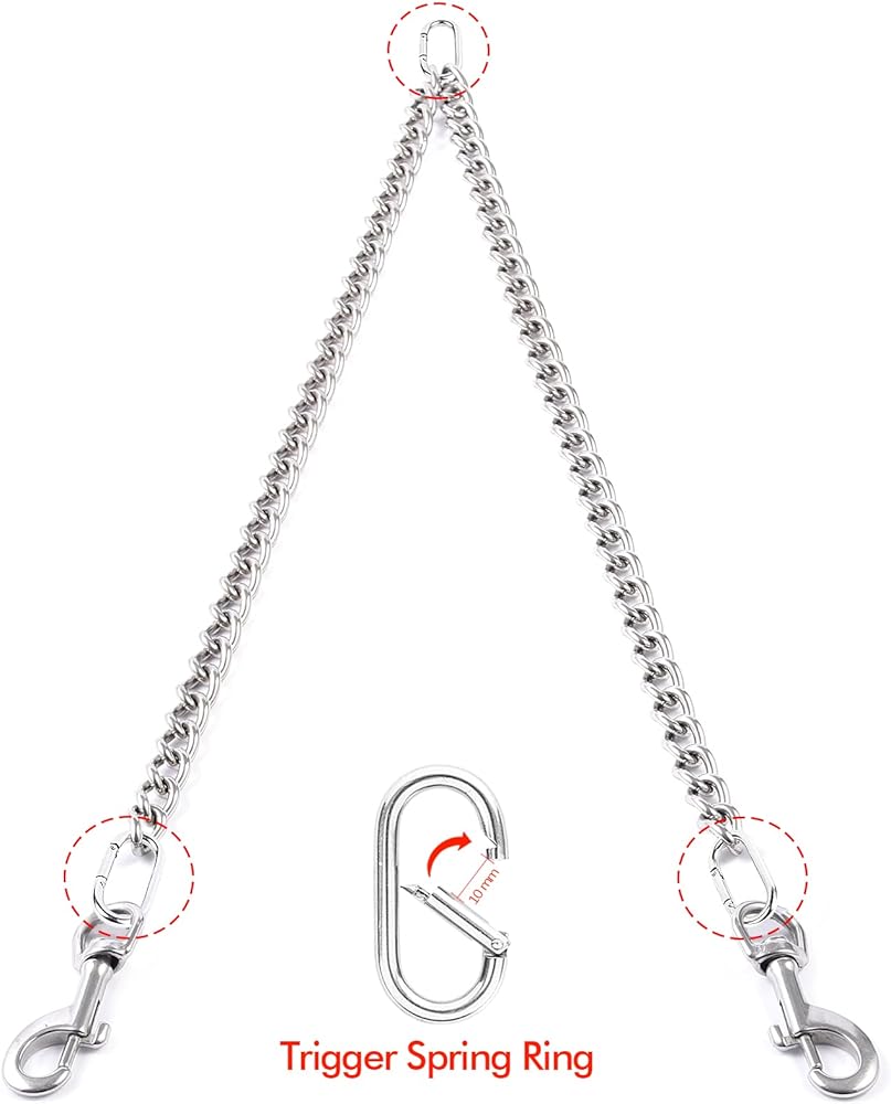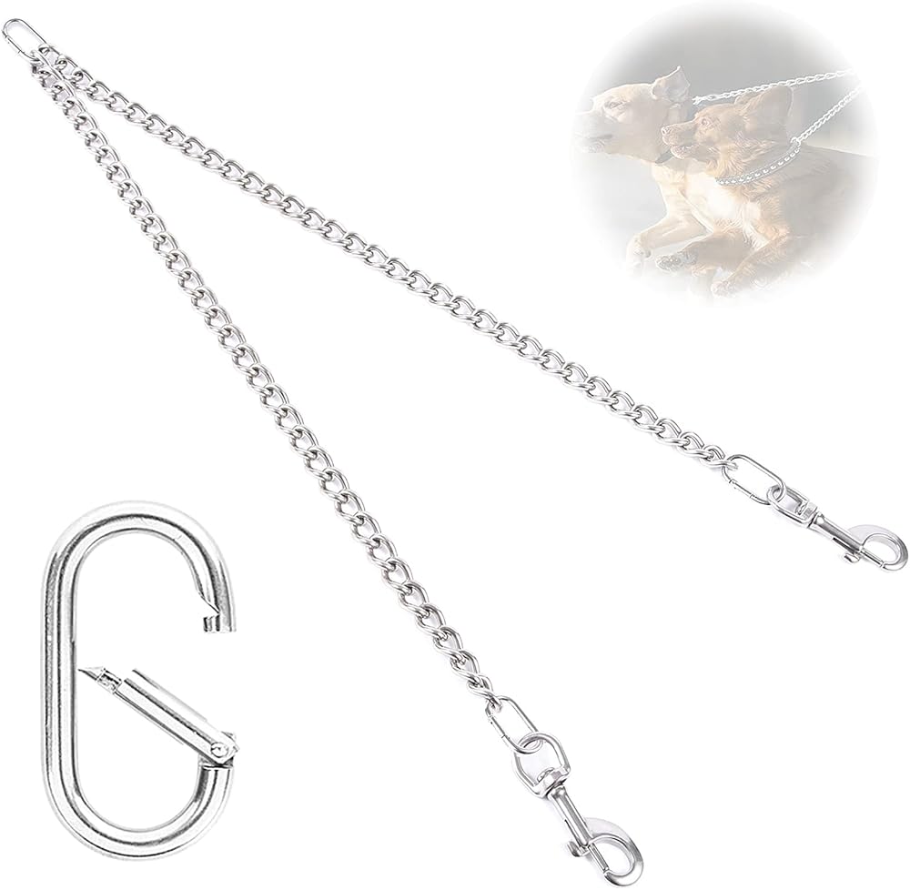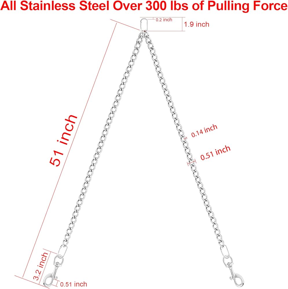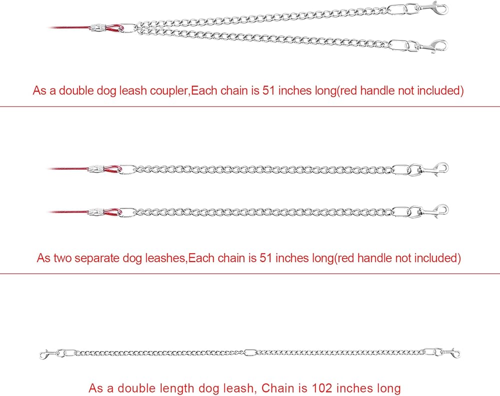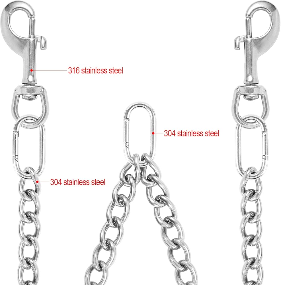 Metal double dog leash Coupler is made of 304 & 316 stainless steel,strong durable and anti-chewing,High quality material will not tarnish,rust,or break,Match most collars and harnesses,each chain links consists of 100% welded stainless steel,smooth edges reduce the risk of scratching skin,Anti-rust,Anti-bite and No-breaking,Heavy duty all steel pet dog lead leashes 2 way Coupler can stand dragging with great strength,for Big Breeds years of use.2 durable swivel snap hooks Flexible to link any dog collars or harness,Twin lead 2 way make it safer for two pet dogs Walking Hiking and Training.2 Way dog chain lead Coupler for 2 dogs with Snap Buckle in the middle,Can be also used for single-head traction when attach it to a handle.Each chain length 52 inch/132cm,104 inch/264cm total length,strength tested to exceed industry standards,Over 300 lbs of Pulling Force,perfect for Medium Large dogs and Giant dog-Rottweiler,Pitbull,Mastiff,Lions,Tigers,Bears,NOT FOR SMALL DOG.