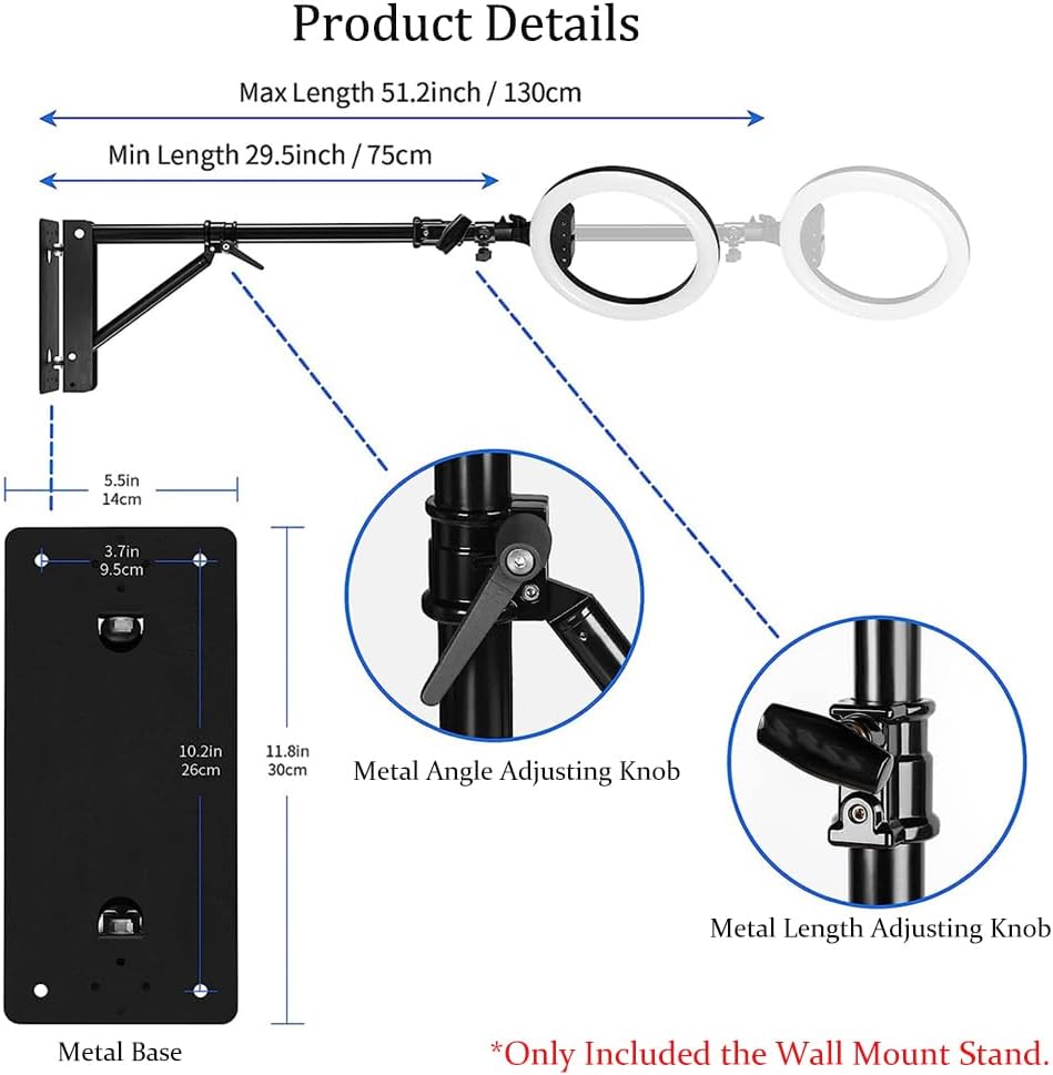 【تصميم قابل للتعديل】تم تصميم حامل الضوء الدائري الخاص بنا ليمتد من 29.5 بوصة/74.9 سم إلى 51 بوصة/130 سم، ويمكن تدويره حتى 180 درجة مما يسمح لك بضبط زاوية حامل جدار استوديو الكاميرا لتلبية احتياجاتك.
