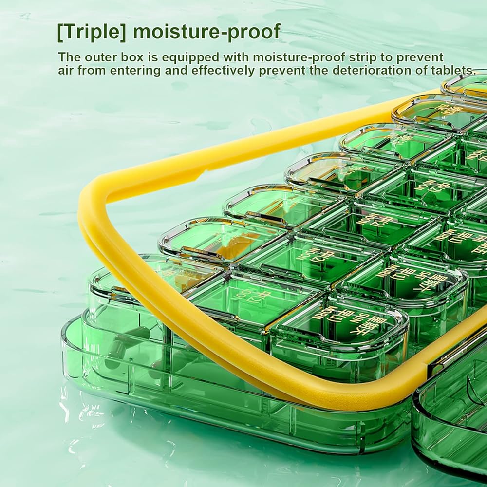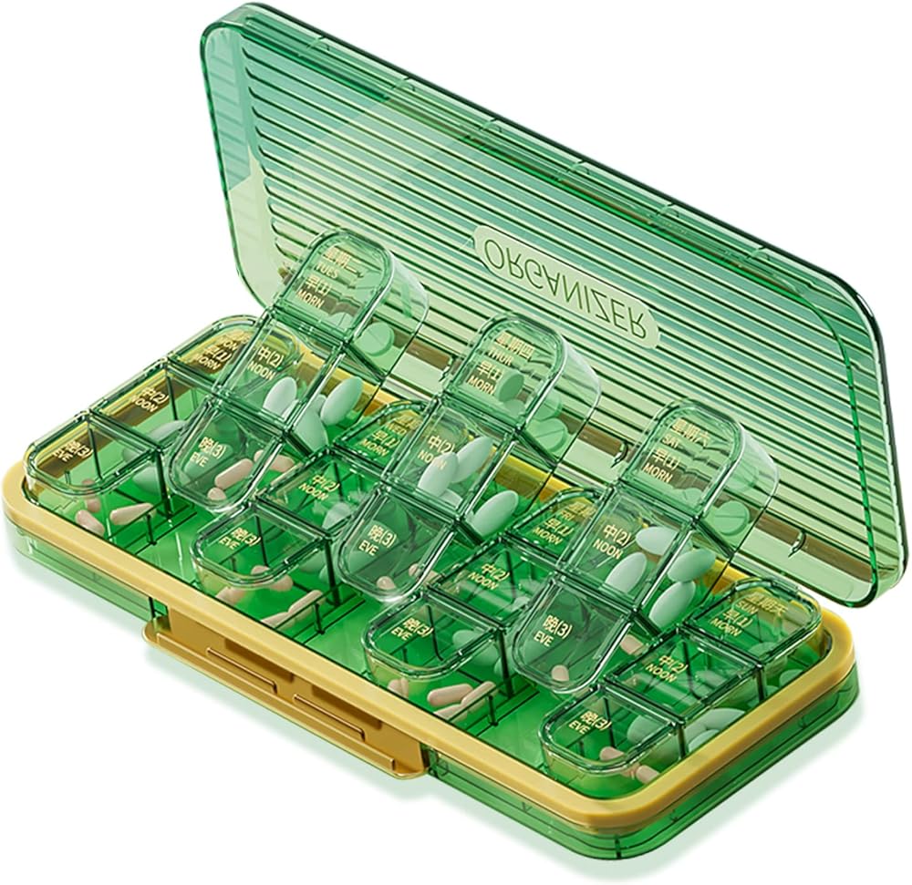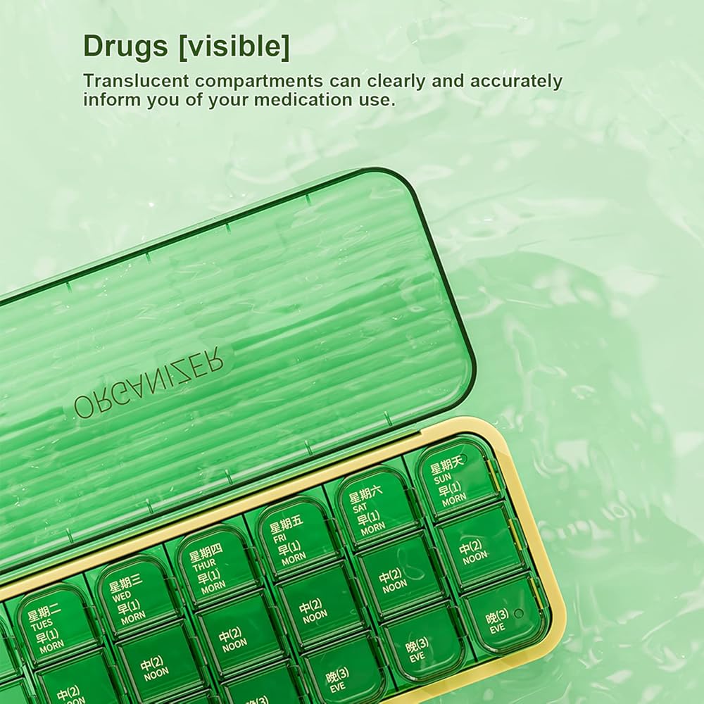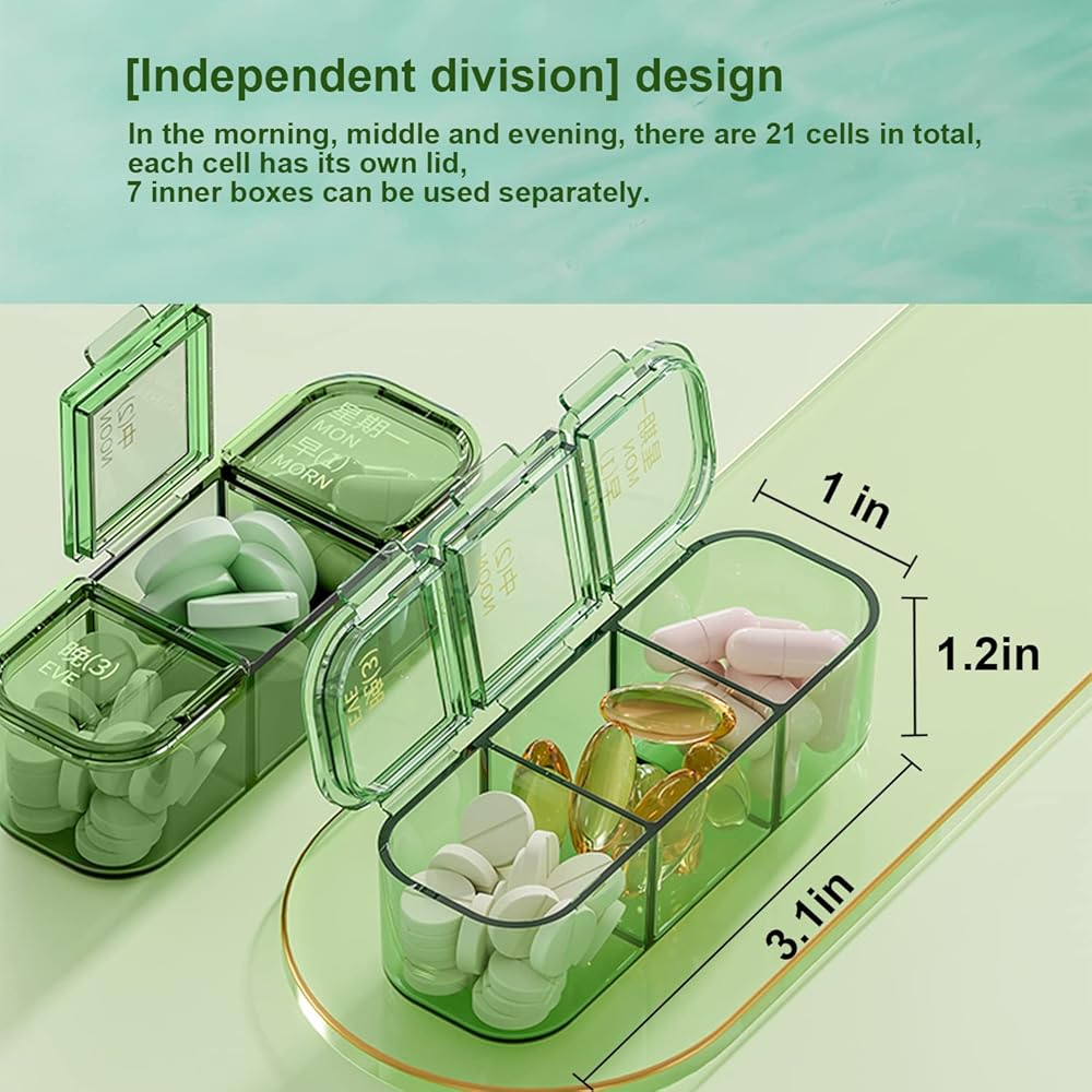 تم تصميم منظم حبوب الدواء بـ 21 مقصورة، كل منها يتكون من ثلاث مساحات تخزين مستقلة ليوم واحد، حتى تتمكن من التخطيط صباحًا لمدة 7 أيام؛ الفيتامينات أو الأقراص التي تحتاجها في الظهيرة والليل