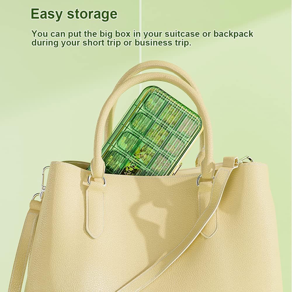 يتكون صندوق حبوب الدواء من صندوق كبير بقفل وسبعة صناديق مستقلة أصغر. يحتوي كل صندوق صغير على ثلاث مساحات تخزين مكعبة مستقلة غير قابلة للفصل، مما يسمح لك بالتخطيط لأدويتك الأسبوعية في الصباح والظهر والمساء.
