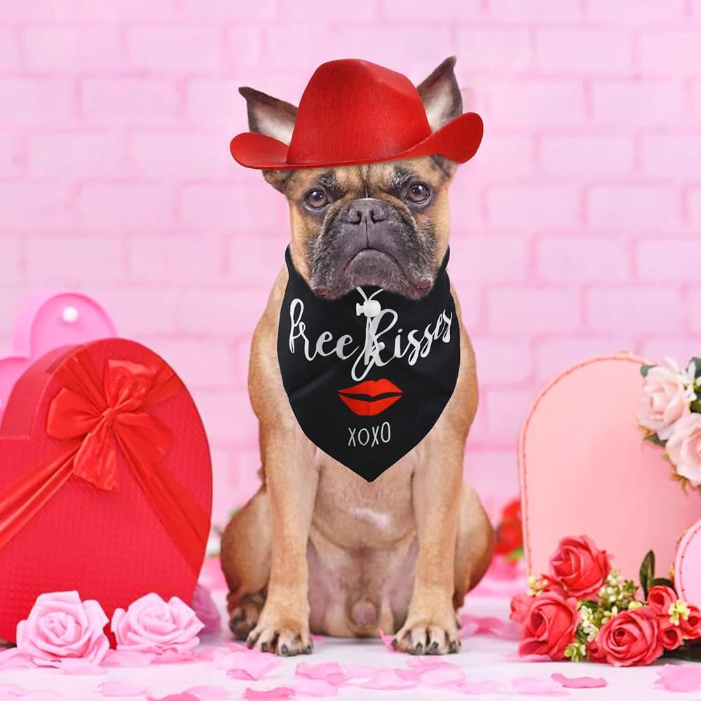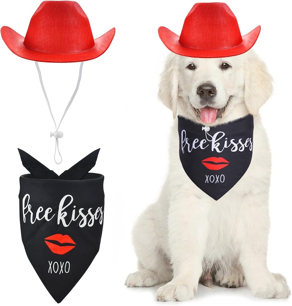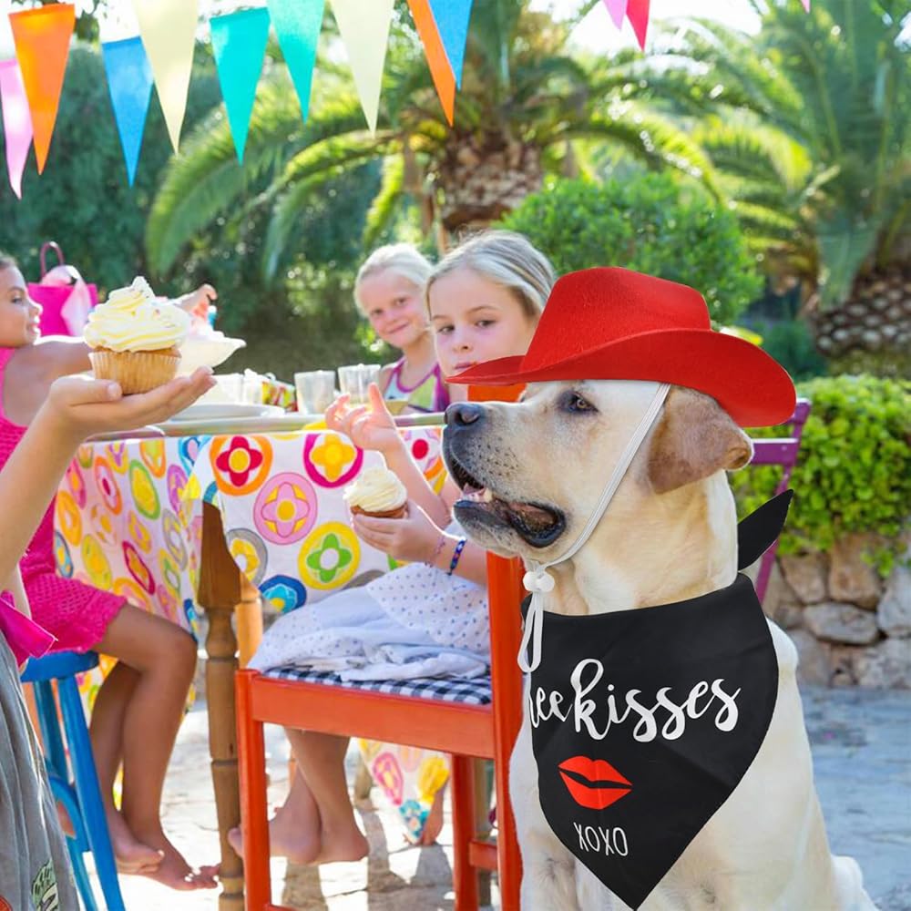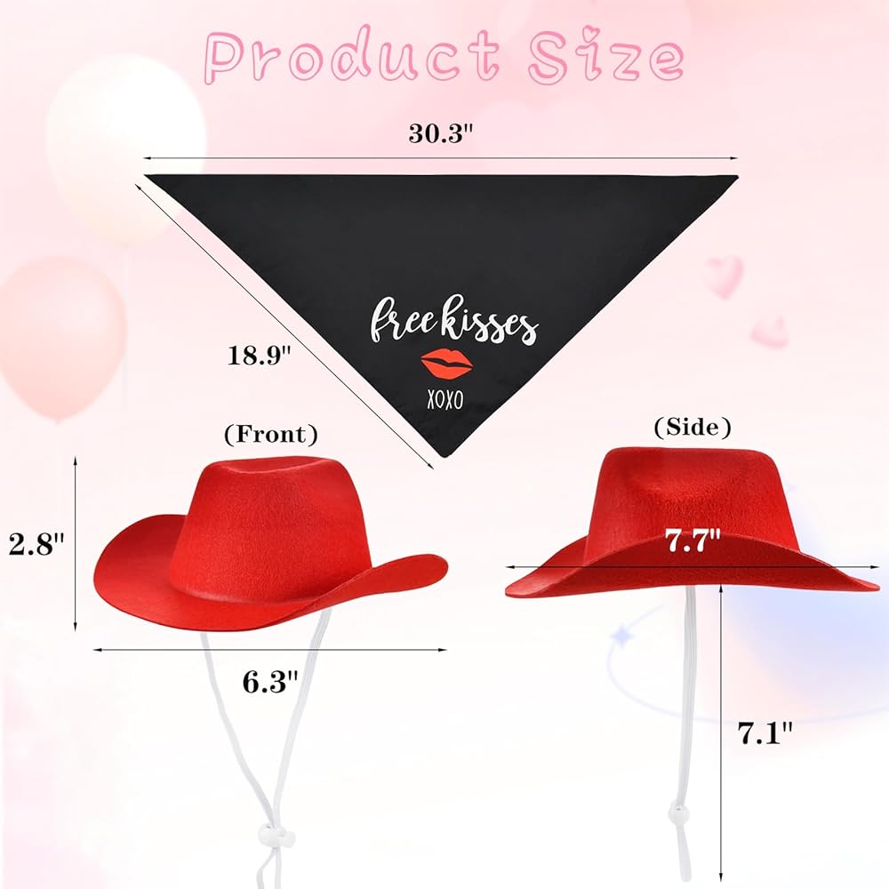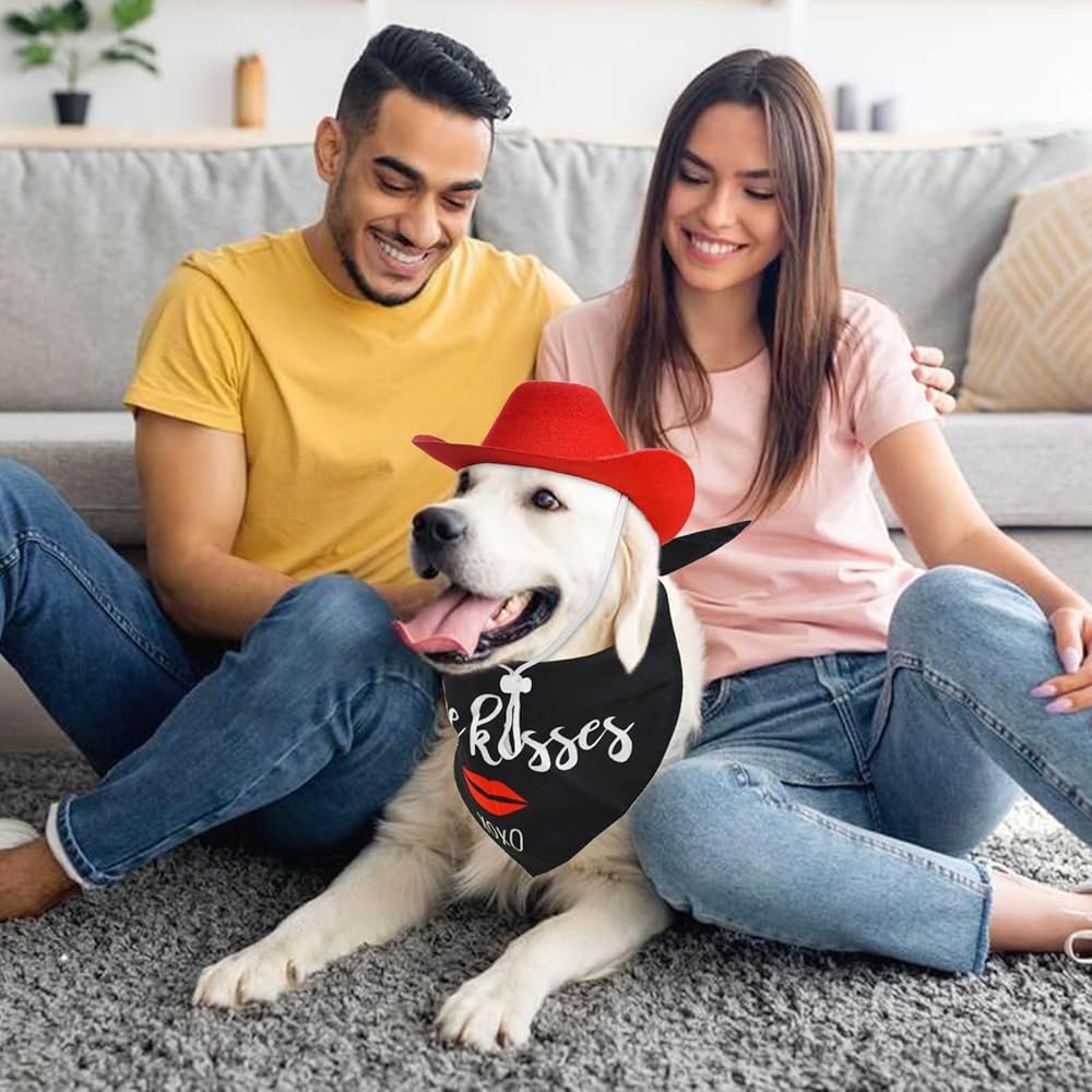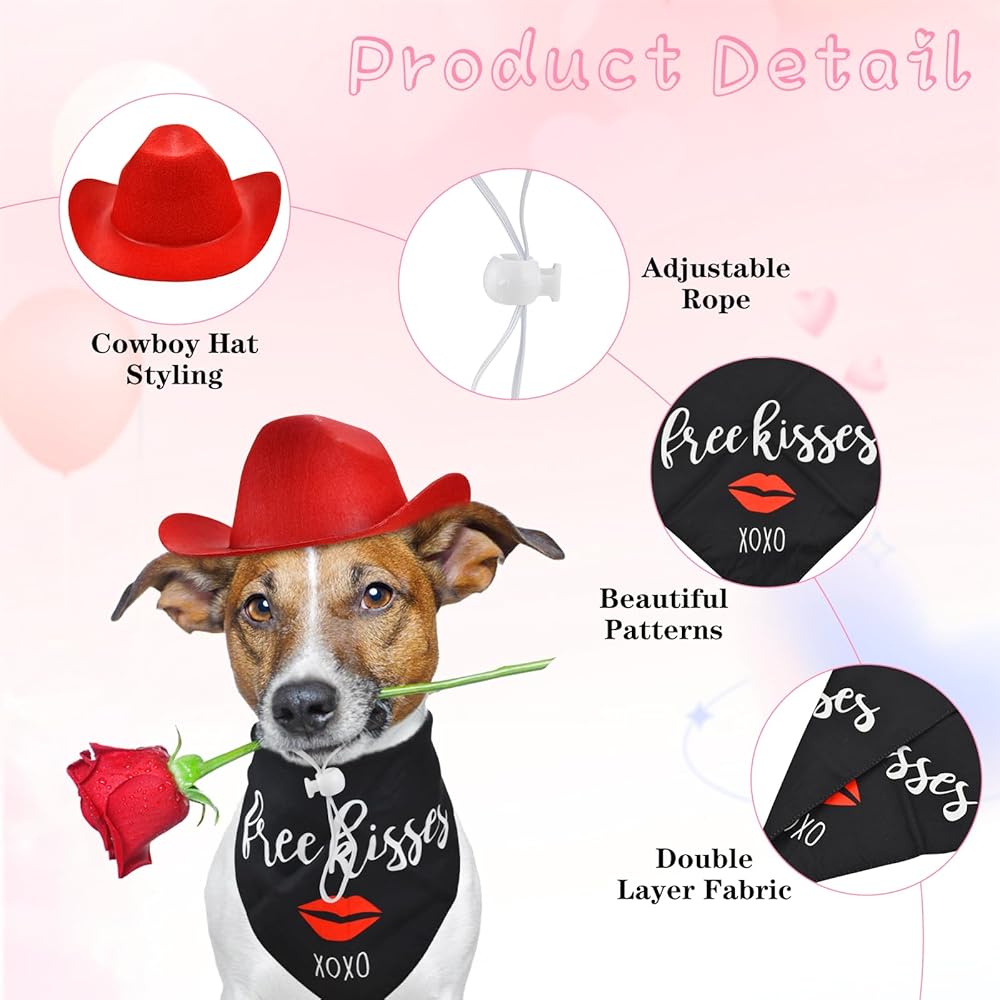 ❤مجموعة ساحرة لعيد الحب: اجعل صديقك المكسو بالفراء جاهزًا ليوم كيوبيد المفضل مع قبعة رعاة البقر الحمراء المبهجة ومجموعة باندانا "Kiss Me"، المصممة لنشر الحب والبهجة. مليئة بالنكهة الحلوة والرومانسية، ارتدائها يجعل حيواناتك الأليفة أكثر جمالاً وجمالاً.