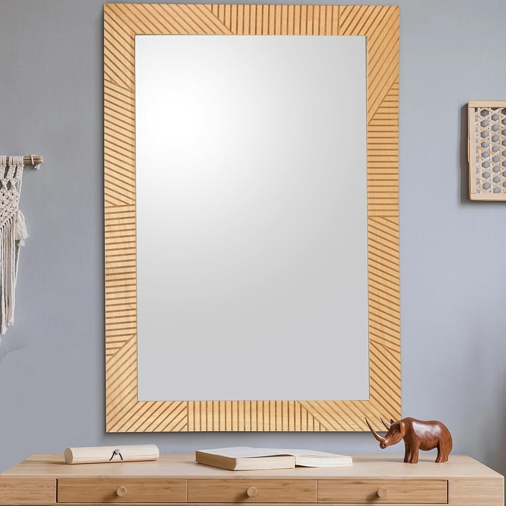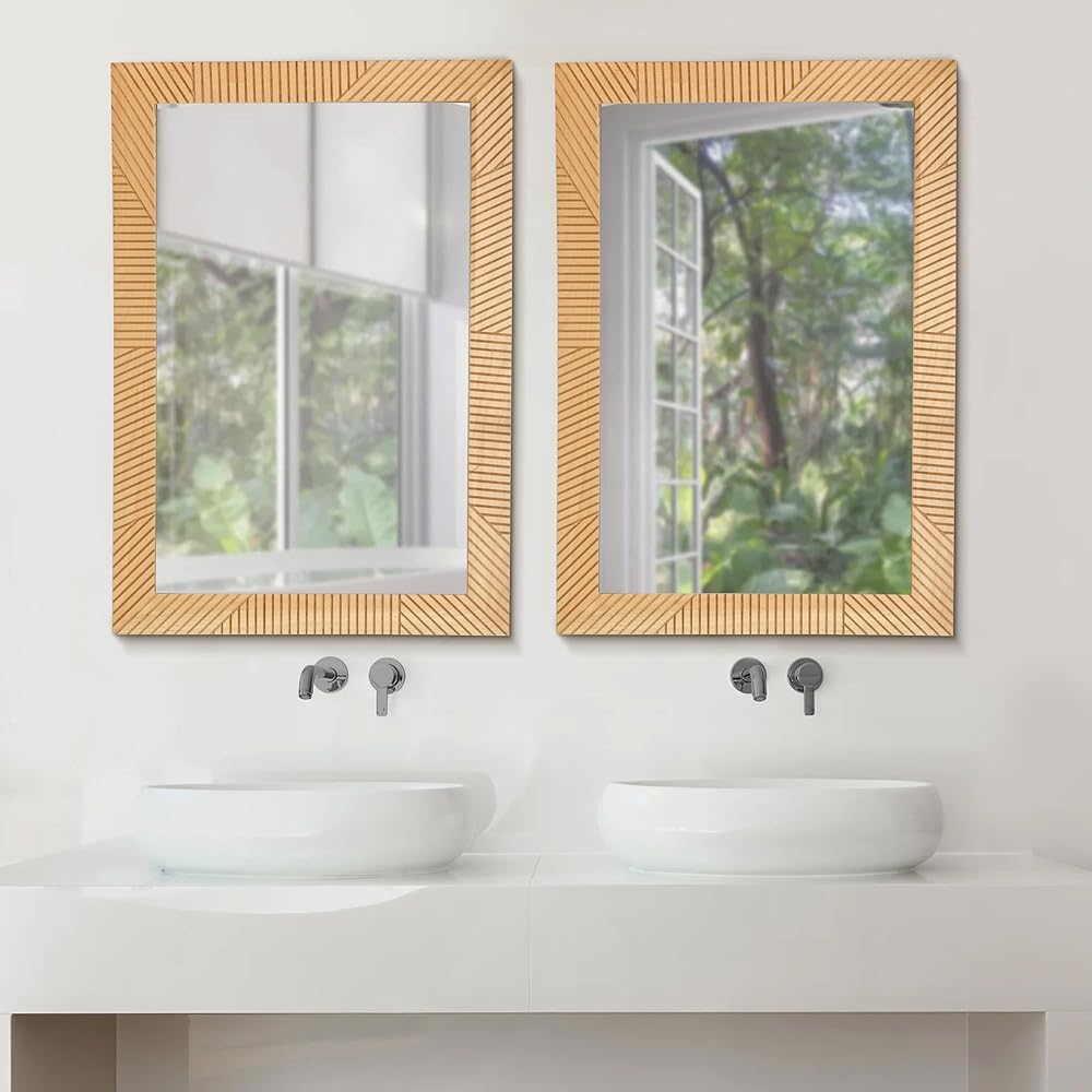 Hand carved of beech with fluted ridges, our exclusive round mirror lends rustic beauty and sculptural intrigue to a room. Over a dresser, console table or bathroom sink, this earthy and elegant wall mirror is a brilliant way to add light and visual space to your interior.