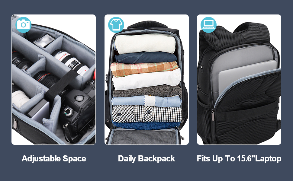 ✅【يمكن استخدامها كحقيبة ظهر يومية】: بعد إزالة هذه الفواصل الداخلية المبطنة، يمكنك استخدامها كحقيبة ظهر عادية للاحتفاظ بالكمبيوتر المحمول أو الكتب أو الملابس أو ملحقات السفر أو أي أشياء أخرى محمولة، ولا تستخدم فقط كحقيبة ظهر للكاميرا.