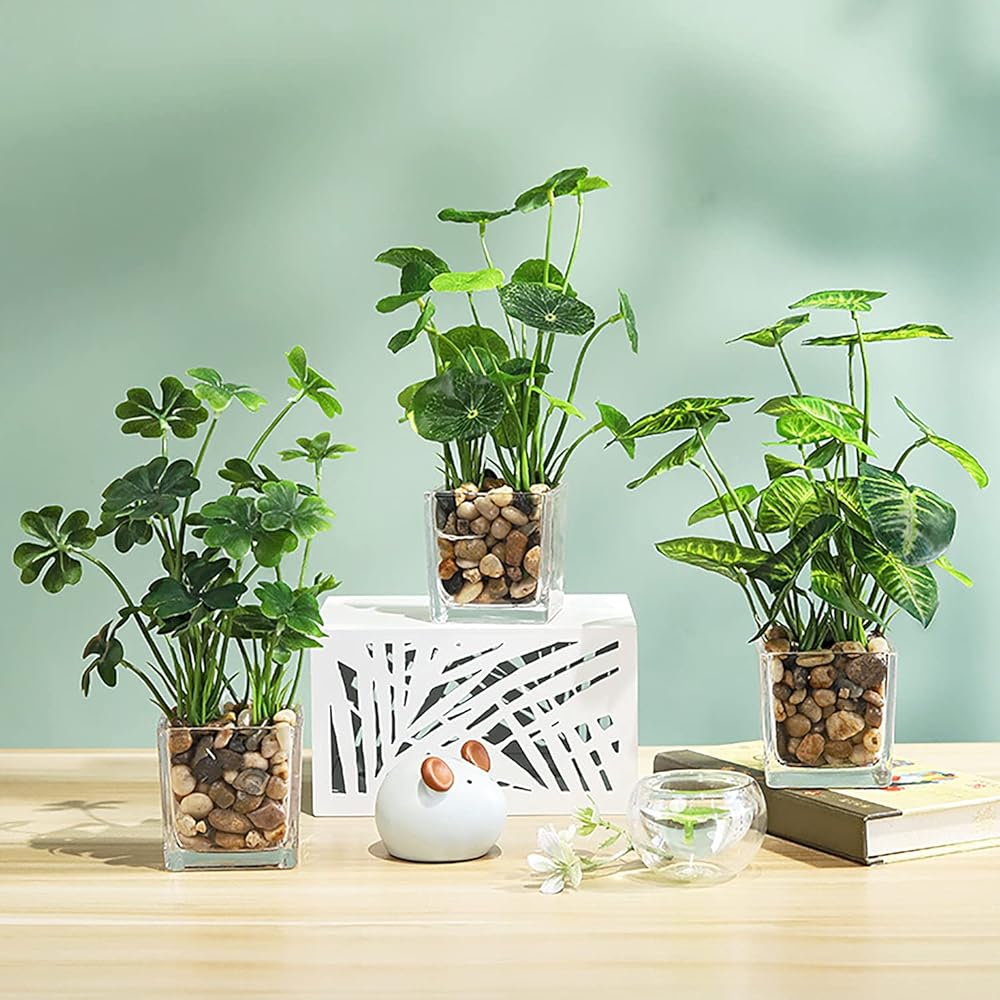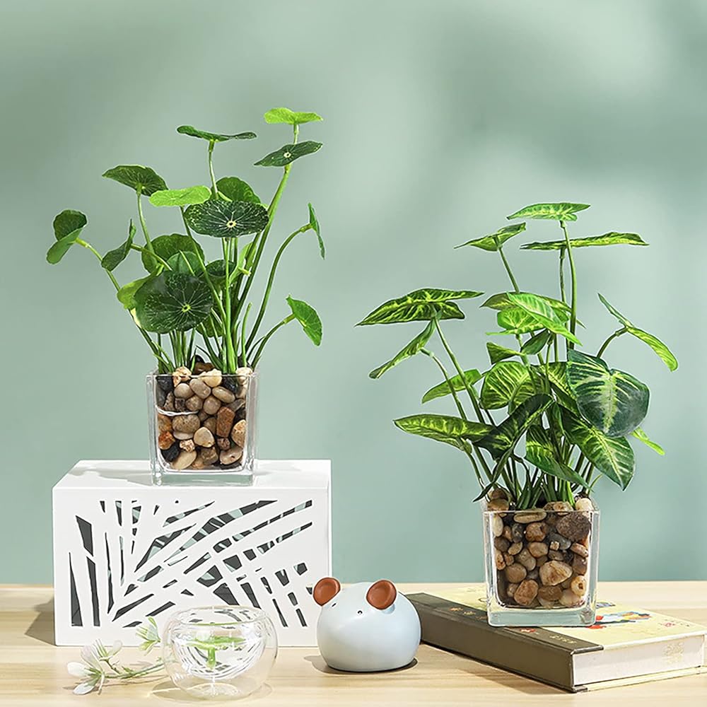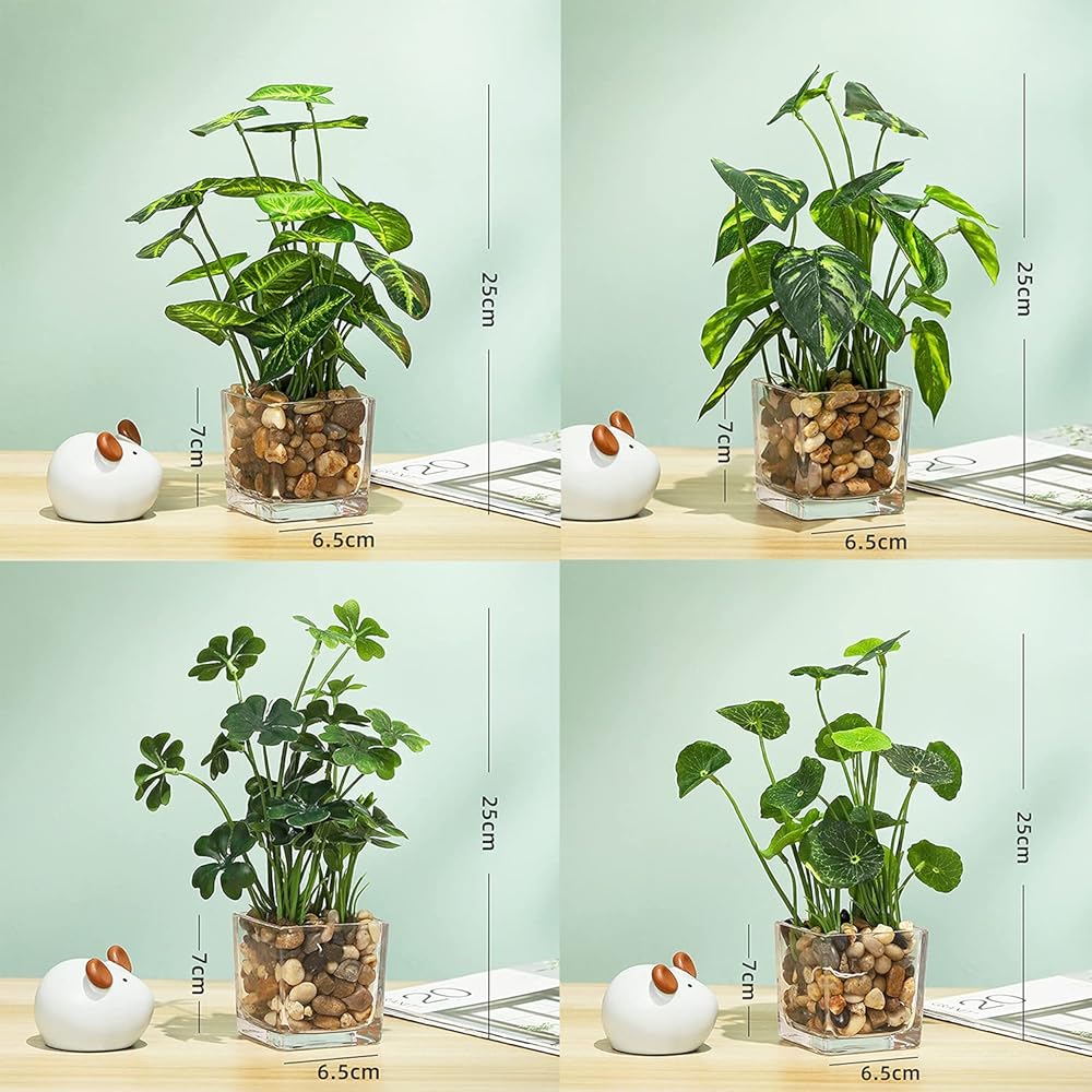 مجموعة من 4 قطع من نباتات خضراء توضع على سطح الطاولة مع أواني زجاجية شفافة وأحجار مرصوفة، تتضمن القلقاس الصناعي واللوتس والبرسيم واللبلاب لديكور المنزل والمكتب