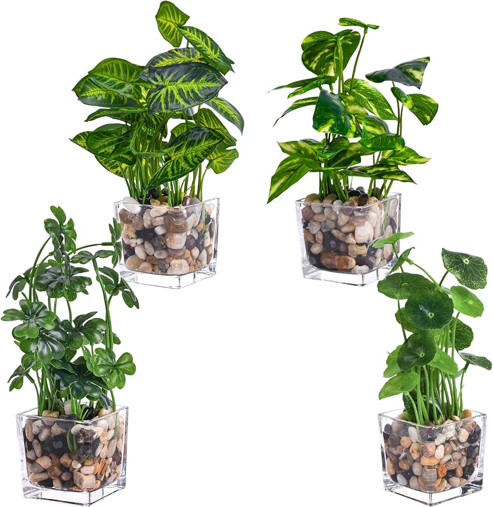 مجموعة من 4 نباتات خضراء صناعية نابضة بالحياة موضوعة في أوعية زجاجية شفافة مع أحجار مرصوفة مزخرفة.