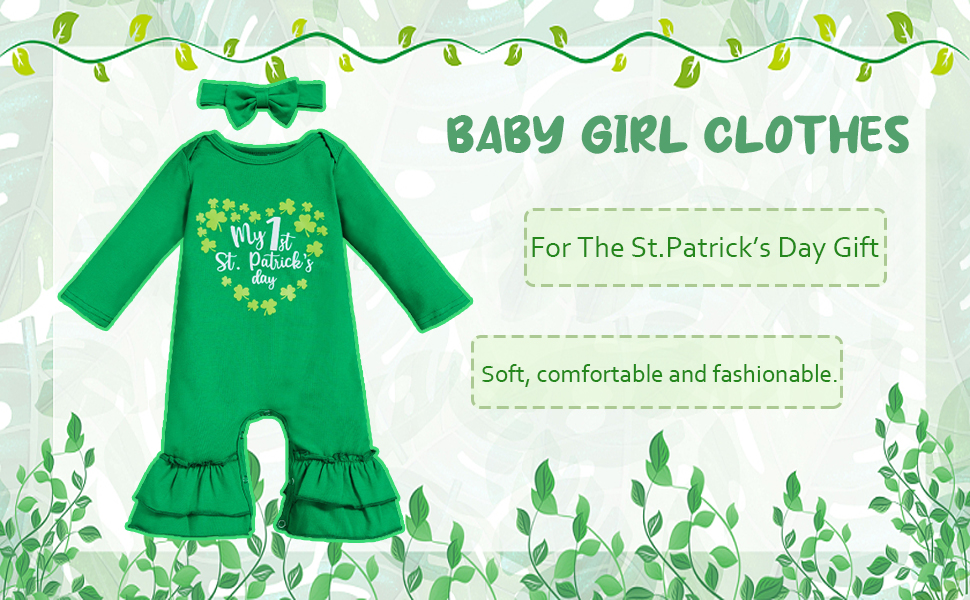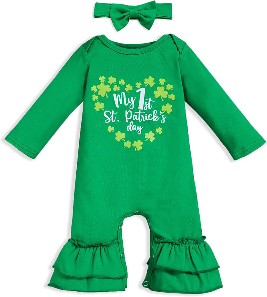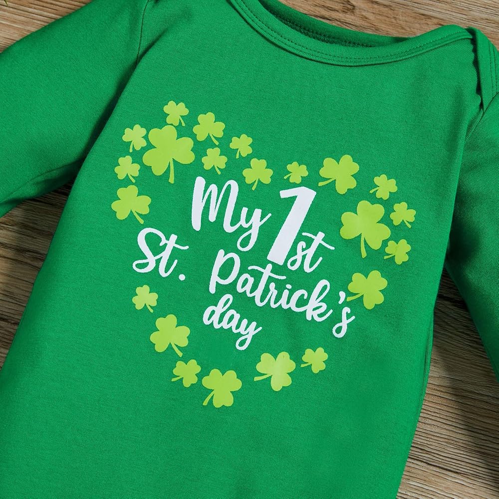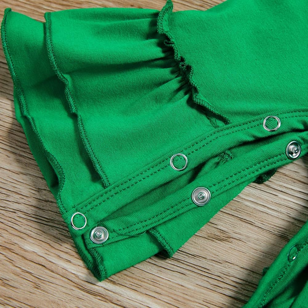ميزة أنيقة ولطيفة: بدلة قفز مكشكشة للفتيات الصغيرات، طبقات ثلاثية مكشكشة حول فتحة الساق، عصرية وأنيقة، تجعلها أنيقة لأميرتك. ملابس الخريف والشتاء بأكمام طويلة من قطعة واحدة، طباعة نبات النفل، بذلة My 1st St. Patricks Day تتميز بثلاث طبقات كشكشة عند فتحة الأكمام والسراويل، لطيفة ورائعة.