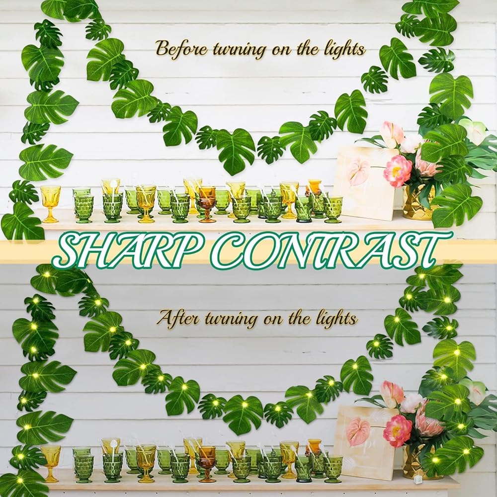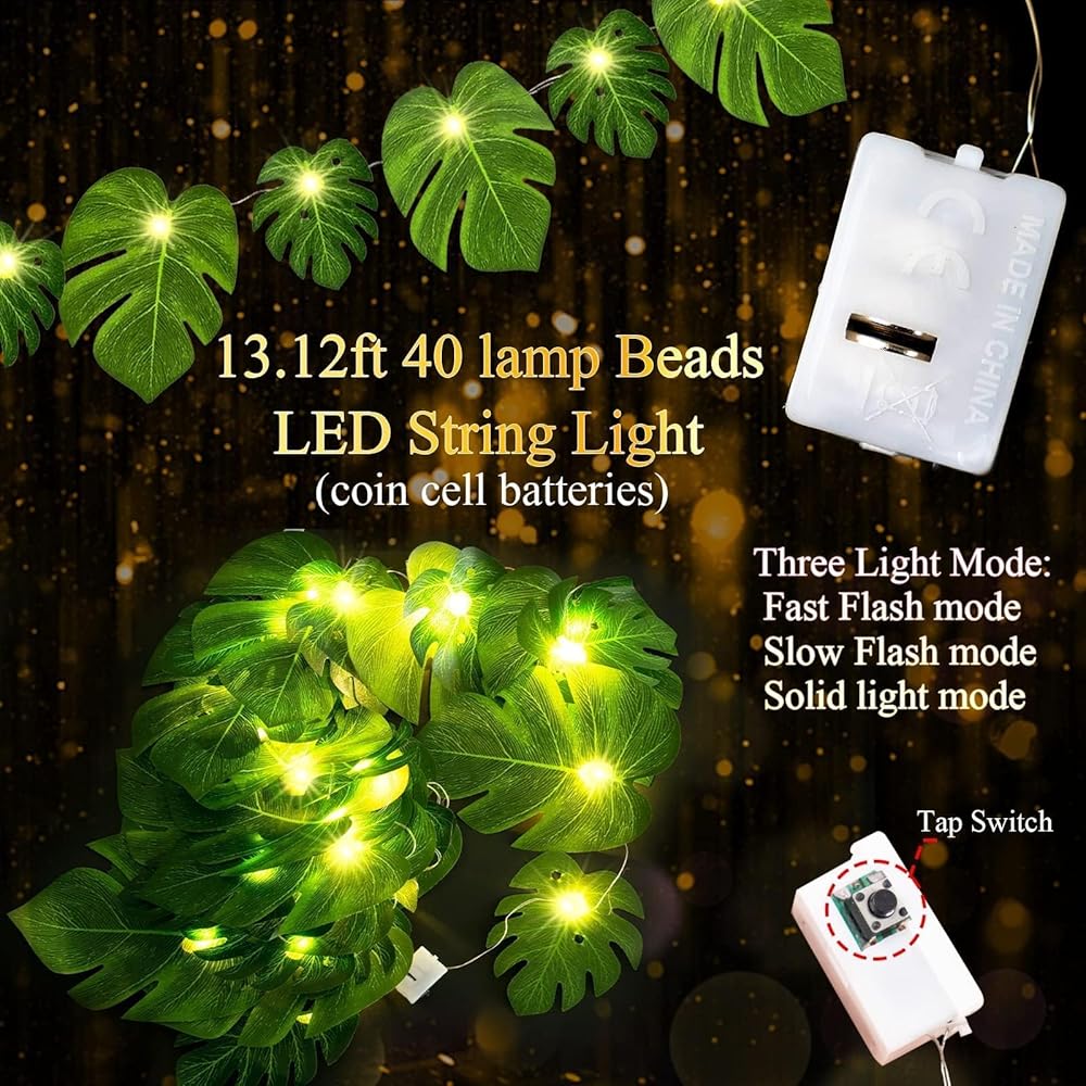 تعليق متوهج: سوف يضيء ضوء سلسلة Monstera leaf LED الذي يعمل ببطاريات الزر ليلة حفلة هاواي الخاصة بك! تحتوي على 3 قوالب إضاءة: وميض سريع، وميض قصير، ودائمًا على القالب، الأضواء المختلفة ستجعل حفلتك أكثر سحرًا ورائعة.