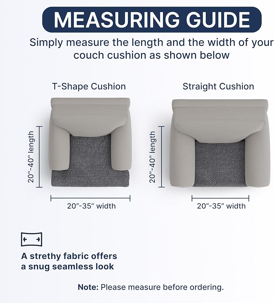• ملاءمة مثالية - مقاس واحد: يمكن استخدام أغطية وسائد المقعد للكراسي والأرائك ذات التكوينات المختلفة (الأقسام متضمنة). تناسب وسائد T والوسائد الصندوقية، ويبلغ طولها من 20 إلى 40 بوصة وعرضها من 20 إلى 35 بوصة. يرجى القياس قبل الشراء.