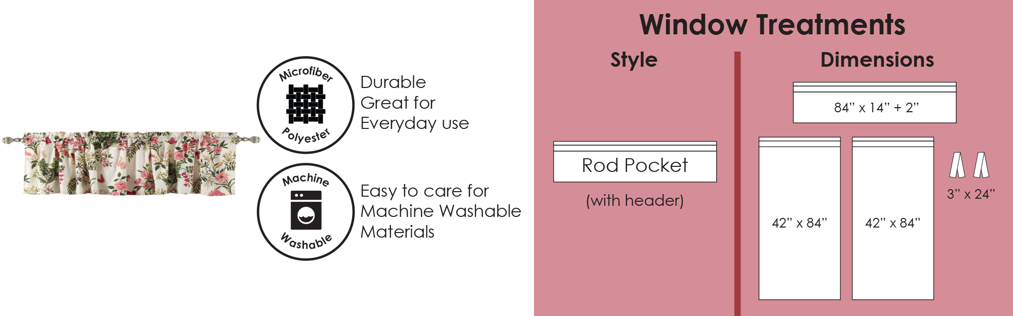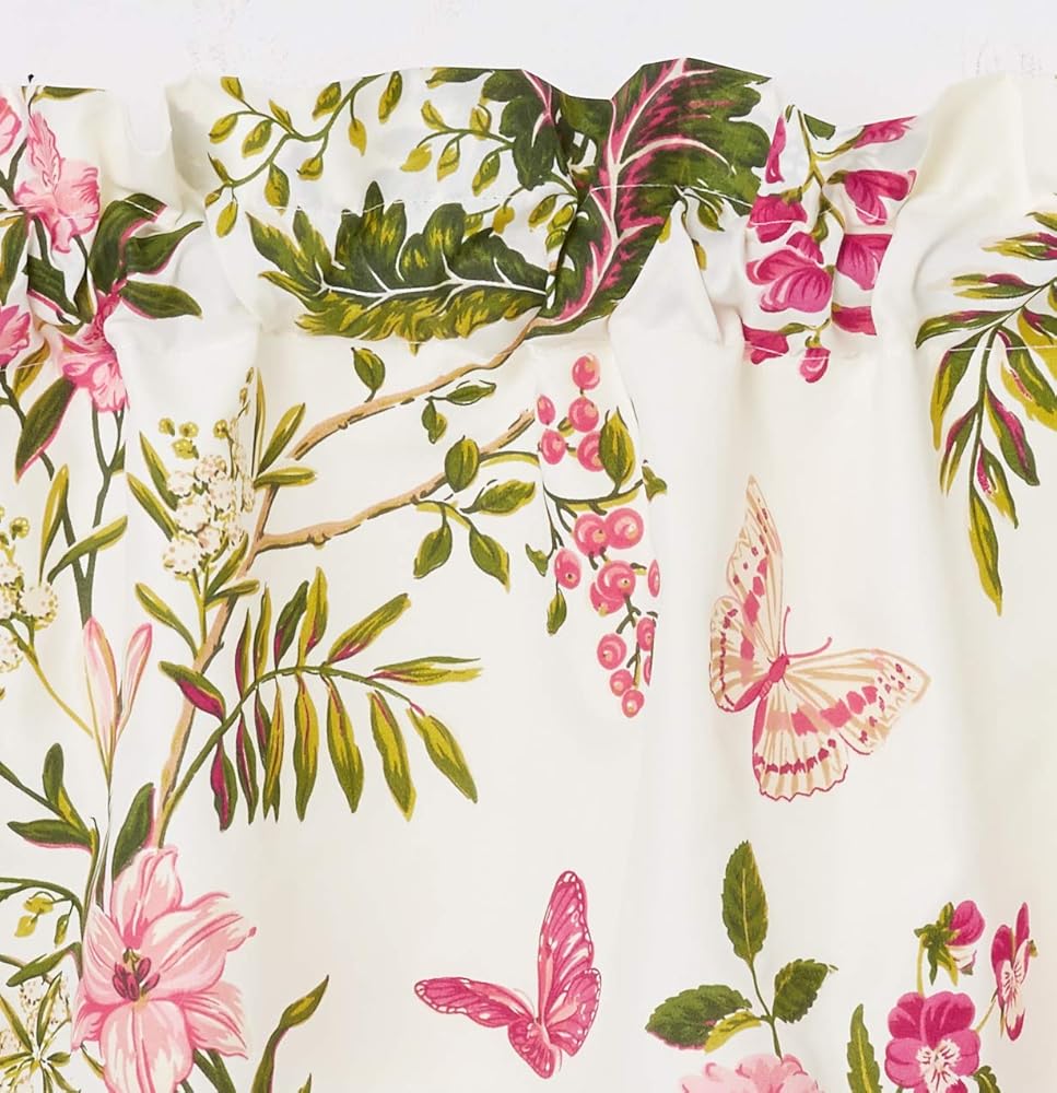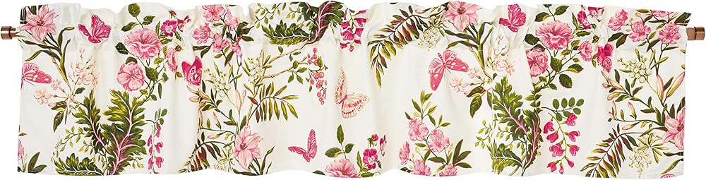 Enhance your space with outdoor charm! Butterflies valance fills your space with vivid florals and butterflies, this traditional valance is lined with solid color fabric for increase privacy and sun protection. Dimensions: 84" wide and 14" long, plus 2" header. 100% polyester face, back (2 ply). Three-inch rod pocket fits most curtain rods for hanging. Machine wash. Imported.