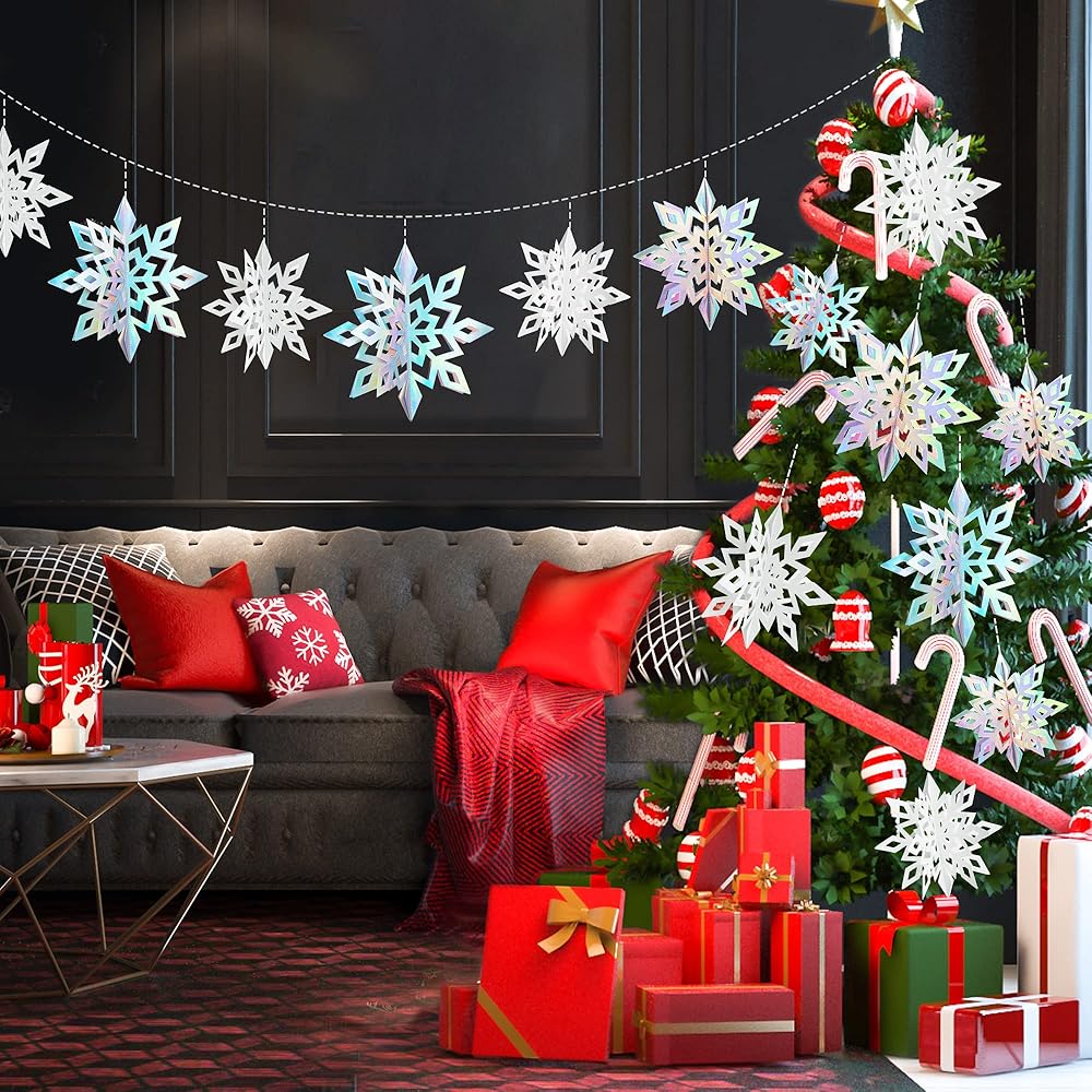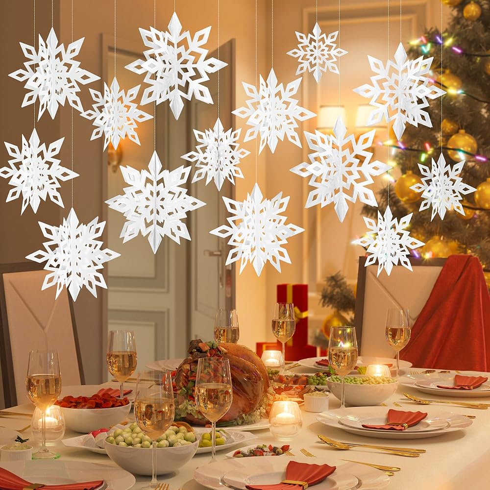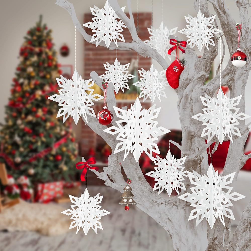 【تصميم مجسم ثلاثي الأبعاد】يمكن تعليق رقاقات ثلج عيد الميلاد بتصميم ثلاثي الأبعاد فريد على أشجار الكريسماس والممرات والمداخل والأسقف والنوافذ والجدران والمتاجر والشرفات وأغصان الأشجار، مما يجعل هذه الأماكن رائعة ورومانسية.