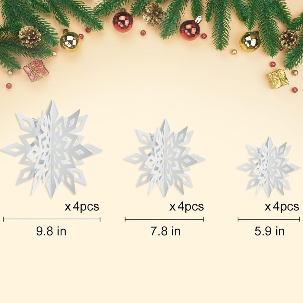 【مجموعة زينة ندفة الثلج】 سوف تحصل على 12 قطعة من ندفات الثلج الورقية ثلاثية الأبعاد بألوان قوس قزح في 3 أحجام مختلفة، بما في ذلك 9.8 بوصة 4 قطع، 7.8 بوصة 4 قطع، و5.9 بوصة 4 قطع.