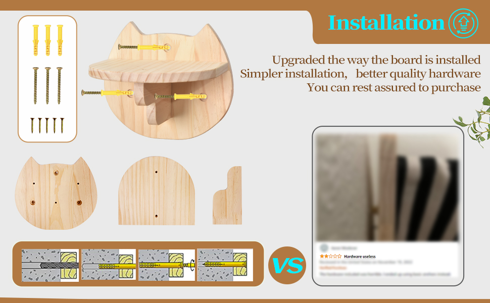 سهلة التركيب: سنقدم تعليمات مفصلة مع العبوة، ويتضمن المنتج البراغي اللازمة للتركيب لدعمك لتثبيت أرجوحة القطط بسهولة على الجدار الجاف أو الجدار العادي. إذا كانت لديك أي أسئلة حول أرفف الحائط للقطط الخاصة بنا، أو كان لديك أي استيائ، فلا تتردد في الاتصال بنا، وسوف نقوم بإعادتها أو استبدالها لك مجانًا، ونقدم لك خدمة مرضية في غضون 24 ساعة
