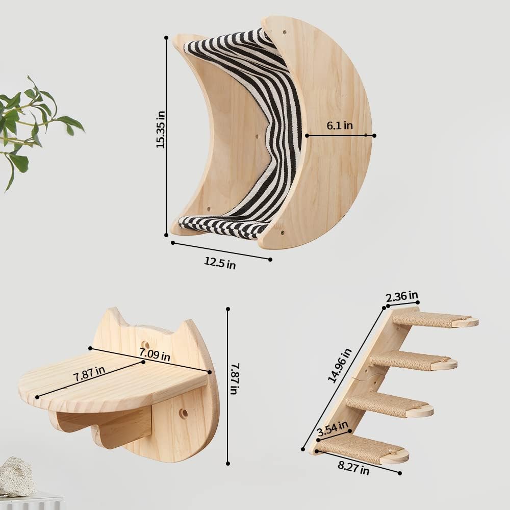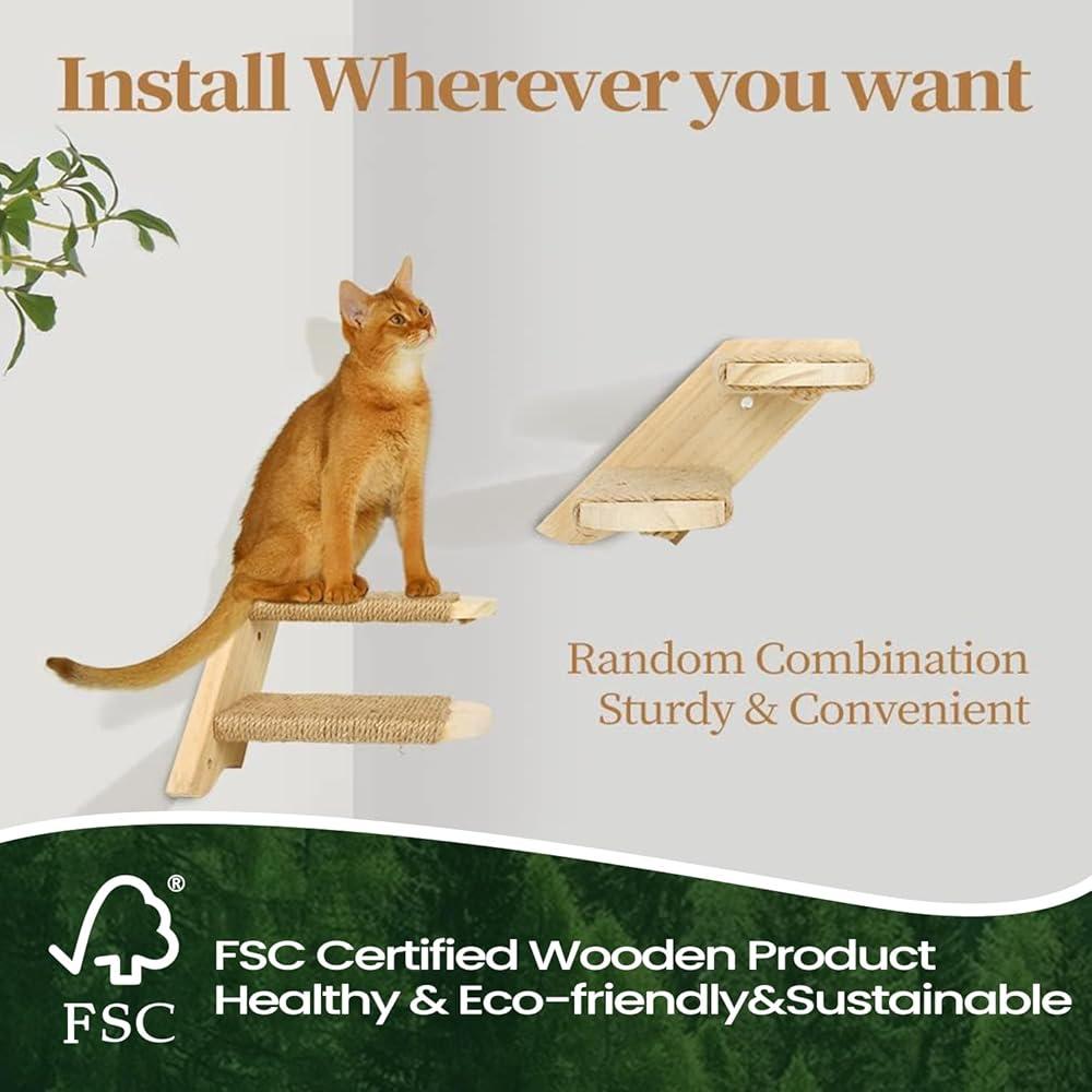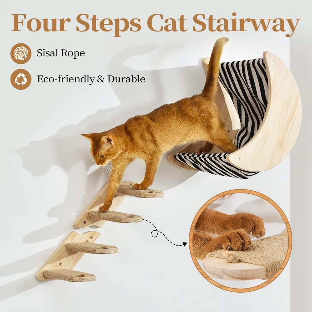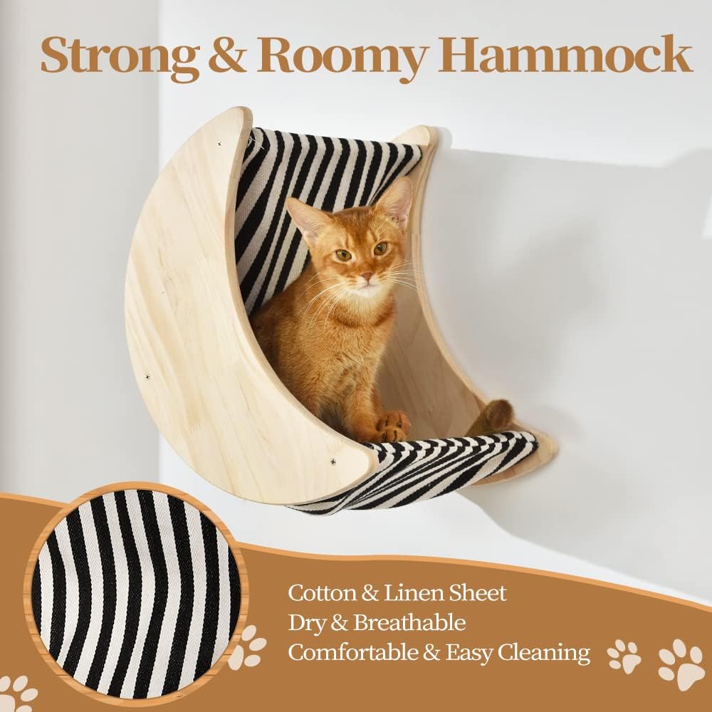 مادة قوية ومتينة: أرفف الحائط وسلالم القطط مصنوعة من خشب الصنوبر الصلب الطبيعي النقي بنسبة 100%، غير مطلية، آمنة وعديمة الرائحة، مصقولة وناعمة ولن تؤذي نتوءات خشبية وسادات القطط. سلالم القطط ملفوفة بحبال السيزال، وهي مقاومة جدًا للخدش للقطط. أرجوحة القطط مصنوعة من القماش مع القطن والكتان، متينة وناعمة، ويمكن إزالتها بسهولة للغاية للغسيل ولا تبهت