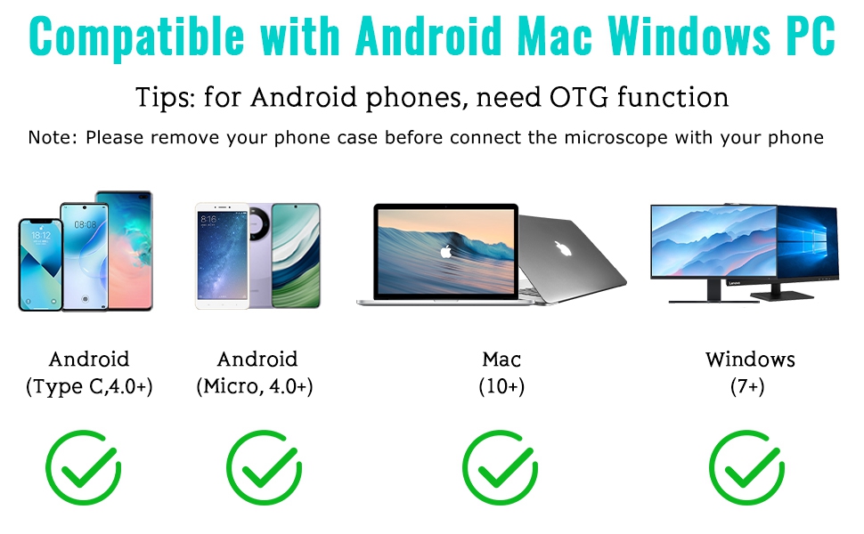 - متوافق مع هواتف Android وMac وWindows PC، استمتع براحة استخدام هذا المجهر مع جهازك المفضل.
