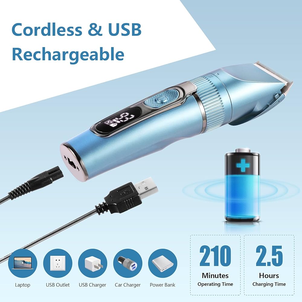 قابلة للشحن بدون سلك وUSB - تتميز ماكينة قص الحيوانات الأليفة ببطارية عالية السعة توفر 3-4 ساعات من وقت التشغيل بعد شحنها بالكامل. مما يسمح بالتنظيف المستمر للكلاب أو القطط الصغيرة والكبيرة.